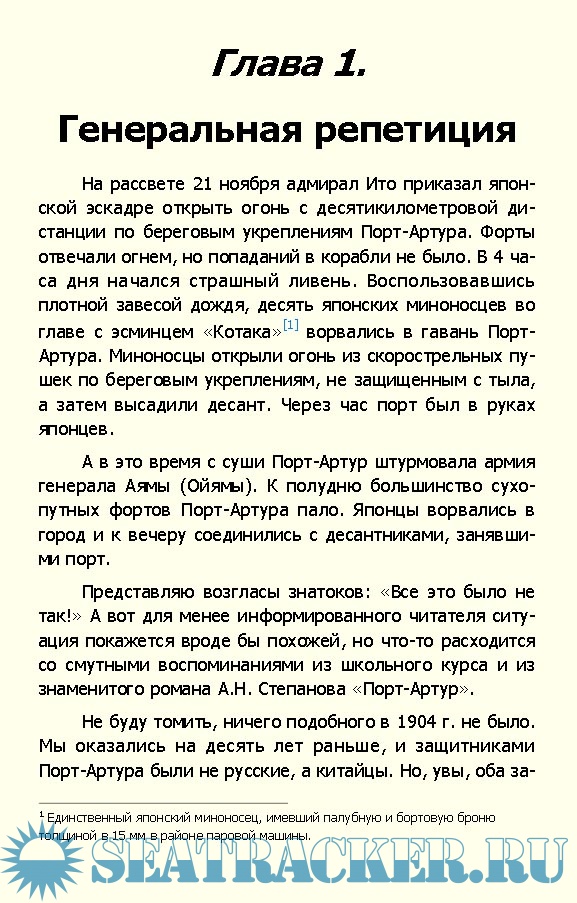Глава 1. Генеральная репетиция 1 Глава 2. Разруха в головах 6 Глава 3. Русская армия и флот к 1904 году 15 Глава 4. Путешествие Николая II в Японию 19 Глава 5. Строительство Великого Сибирского пути 21 Глава 6. Порт-Артур становится русским портом 24 Глава 7. Участие России в интервенции в Китае 28 Глава 8. Нападение китайцев на КВЖД 34 Глава 9. Боевые действия в бассейне Амура 37 Глава 10. Разгром «боксеров» и китайских войск в Маньчжурии 39 Глава 11. Становление Желтороссии 41 Глава 12. Строительство морской базы и крепости в Порт-Артуре 45 Глава 13. Подготовка Японии к войне 50 Глава 14. История с итальянскими крейсерами 51 Глава 15. Порт-артурская побудка 52 Глава 16. Тайна гордого «Варяга» 55 Глава 17. Порт-Артур готовится к осаде 57 Глава 18. Русская армия в Маньчжурии 59 Глава 19. Блокада японским флотом Порт-Артура и гибель адмирала Макарова 61 Глава 20. Захват японцами Северной Кореи 68 Глава 21. Боевые действия на море с 1 апреля по 2 мая 1904 года 70 Глава 22. Высадка японцев на Ляодунском полуострове и бои на юге Маньчжурии в мае — августе 1904 года 71 Глава 23. Бои на дальних подступах к Порт-Артуру 75 Глава 24. Сражение в Желтом море 77 Глава 25. Тотальная крейсерская война — последний шанс России 79 Глава 26. Много шума из ничего (действия вспомогательных крейсеров) 86 Глава 27. Первый штурм Порт-Артура 88 Глава 28. Второй штурм Порт-Артура 92 Глава 29. Третий штурм Порт-Артура 95 Глава 30. Четвертый штурм Порт-Артура 96 Глава 31. Агония 1-й Тихоокеанской эскадры 98 Глава 32. Капитуляция Порт-Артура 102 Глава 33. Мукденское сражение 103 Глава 34. Стояние на Сыпингайских высотах 105 Глава 35. Как Лэк и Холланд «надули» русских и японцев 106 Глава 36. Оборона Владивостокского района 110 Глава 37. Война и русское общество 111 Глава 38. Россия и Европа (1904–1905) 113 Послесловие 116 Приложение 1. Корабли русского флота (1904–1905) 117 Приложение 2. Корабли японского флота (1904–1905) 122 Список использованной литературы 127 Иллюстрации 128