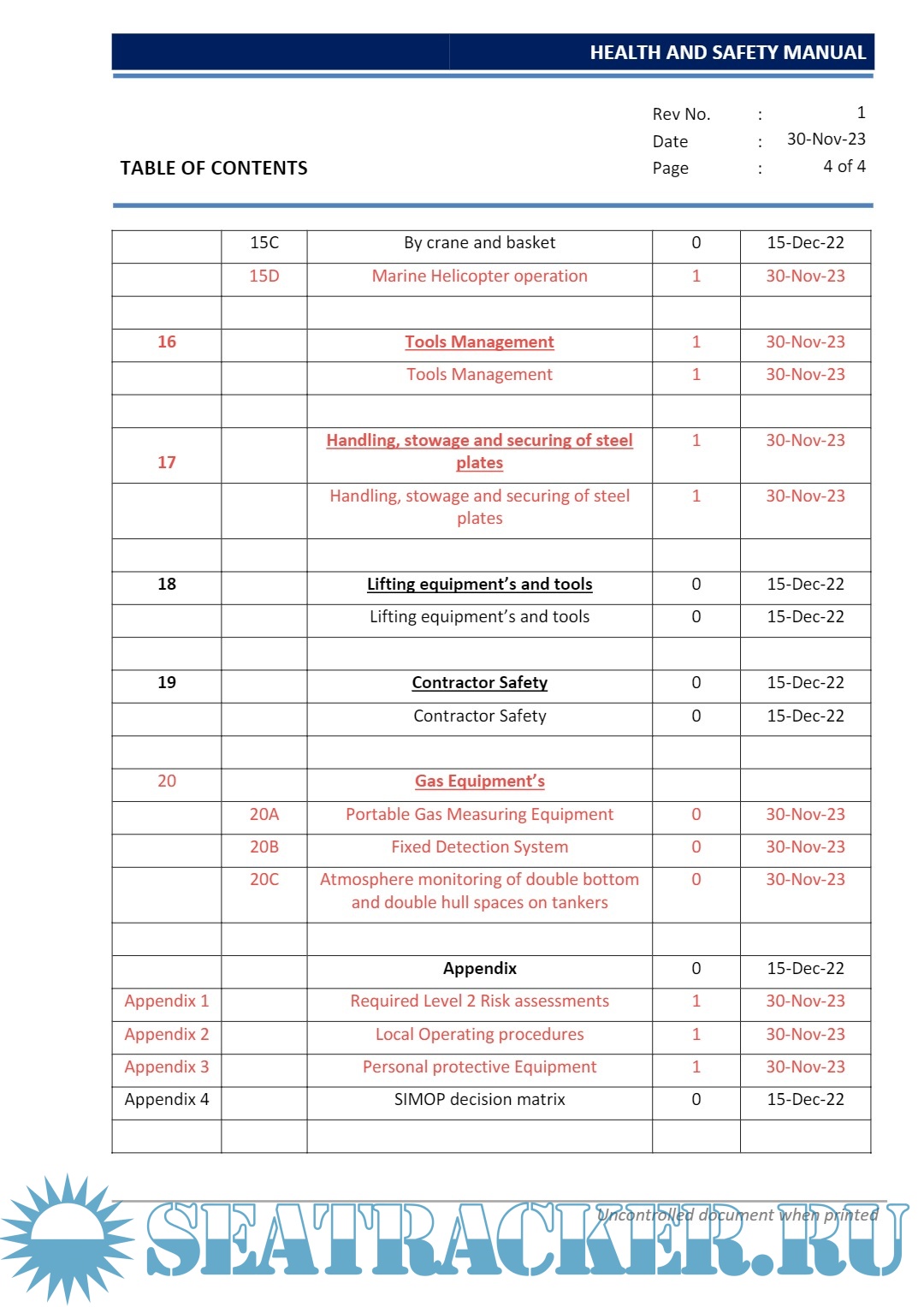 Year: 2023 Language: English Author: Synergy Maritime Pvt. Ltd. Genre: Manual Edition: V | November Format: PDF Quality: eBook Pages count: 319 Description: Safety is a shared responsibility. As an employee, you have a duty to care and responsible for:▪ Safety for yourself and your mates▪ Care towards the vessel and the protection of the Environment.Synergy expects all the employees to operate the vessels, at all times, in compliance with these concepts:▪ No business objective will be pursued at the expense of safety.▪ Accidents and injuries are preventable; all steps should be taken to ensure they do not occur.▪ No job is well done unless it is safely done.You should be committed to the concept that getting the job done and safety go handin-hand, and do not perceive yourself as being under pressure to cut corners or reduce safety margins, to meet schedules or other targets.Remember, you are under no such pressure, and you are not serving the Company’s best interests if you do so. Furthermore, you may well be placing yourself in a position for disciplinary action.You should remember that a single major incident has the potential to ruin the Company, and completely outweighs the possible benefits from taking unnecessary risks.