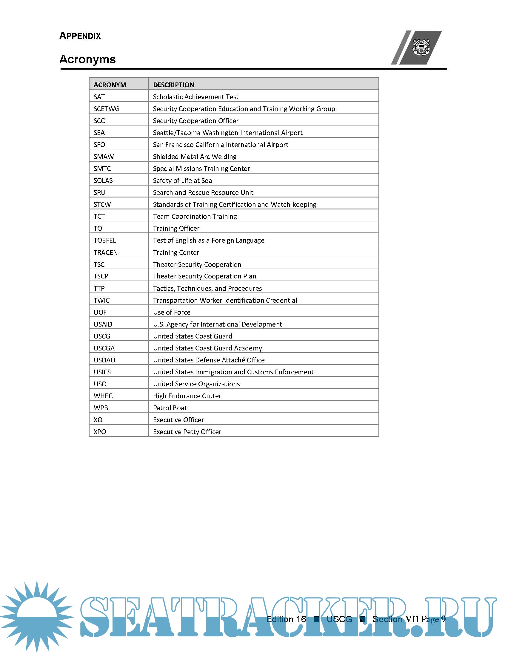 Year: 2019 Language: English Author: U.S. Coast Guard Genre: Handbook Edition: 16 Format: PDF Quality: eBook Pages count: 184 Description: Under the Department of Homeland Security, the U.S. Coast Guard (USCG) is at all times an armed force—a full time military, multi-mission, maritime organization with a true peacetime mission. The USCG work force of 91,000 active duty, auxiliary, reserve, and civilian personnel and more than 2200 vessels and aircraft and 1200 shore locations makes it the world’s greatest coast guard. Structured to meet the diverse missions assigned, the command and control network allows decentralized responsibility and authority. Primary organizational elements include USCG Headquarters; two area commands; nine district commands; thirty five sectors; and field and headquarters units such as training centers. Committed to its reputation as a multifaceted organization with its distinctive blend of military, humanitarian, maritime safety and security, and civilian law-enforcement capabilities, the USCG has a vital international role in support of regional and national security strategies. The USCG provides assistance and training for which the USCG is “especially qualified” to citizens of other countries. This assistance is provided under the authority of 14 USC 141(a) and the Economy Act 31 USC 1535, which requires reimbursement from the assisted federal agencies. The Foreign Assistance Act of 1961, as amended in sec 545 (22 USC 2347d) specifically authorizes training in maritime skills under the international military education and training program. Globally recognized as a master in accomplishing each of the duties with which it has been entrusted throughout its 228-year history, the USCG has also been a leader in using limited resources. The USCG’S main mission areas are maritime safety, maritime mobility, maritime security, national defense, and protection of natural resources. These mission areas encompass operations in aids to navigation, national defense and international engagement, pollution prevention and environmental response, ice conditions, maritime law enforcement, marine inspection, marine licensing, marine science activities, port safety and security, search and rescue, and waterways management. These capabilities are in great demand throughout the world. For example, proficiencies used to interdict narcotics or migrants are also recognized in wider application to assist other nations to combat the global threat of terrorism, threats to maritime safety and security or in areas of piracy, trafficking in persons or interdicting weapons of mass destruction. The ability of the USCG to interface successfully with many diverse agencies stands as an example of interagency, interoperability, cooperation and command communication.