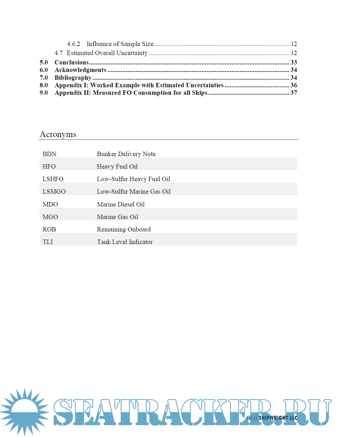 Year: 2018 Language: English Author: J. Travis Hunsucker, Dylan Przelomski, Alex Bashkoff, John Dixon Genre: Research papers Publisher: Shipwright LLC Format: PDF Quality: eBook Pages count: 99 Description: The International Maritime Organization (IMO) has been actively estimating the CO 2 emissions from shipping for over the past decade. The results have been published in the First, Second, and Third Greenhouse Gas Studies (IMO 2015). Amendments to MARPOL Annex VI entering into force on 1 March 2018 will require ships to submit annual fuel oil consumption data to the IMO. The three most widely used methods for collecting data on annual fuel oil consumption are the bunker delivery note (BDN), monitoring tank level indicators (TLI), and using flow metering. The IMO convened this study to examine the uncertainty for each of these methods. The study estimated the uncertainty for each of these methods using 550,000 tonnes of measured fuel oil consumption from approximately 46 ships owned or operated by three companies. Key Findings 1. Annual fuel oil consumption determined from BDN and TLI data were in close agreement; whereas, the values determined from flowmeter data were systematically lower with the differences larger than what can be reasonably associated with fuel oil processing. The relatively large variance of the flowmeter data when compared to the BDN and TLI data suggest that the flowmeter data contain considerable amounts of random error. 2. An uncertainty analysis at a 95% confidence interval estimated that for all of shipping, the annual HFO fuel consumption determined from TLI and flowmeter data would have the following differences when compared to BDN data. • TLI: 0.33% ± 1.8% • Flowmeter: -12% ± 6.5% It is unknown if the relatively poor agreement of the flowmeter data in comparison to BDN and TLI sources are a coincidental artifact unique to these companies or if these findings are emblematic of accuracy problems observed in other types of shipboard data. 3. Combining the results with the literature survey for this study, the overall uncertainty for each of the fuel oil measurement methods was estimated as follows: • BDN: 3% for HFO and MGO/MDO • TLI: 5% for HFO and MGO/MDO • Flowmeter: 8% for HFO and 10% for MGO/MDO