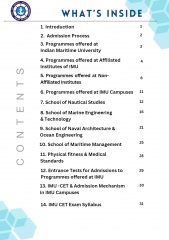 Year: 2024 Language: English Author: Indian Maritime University (IMU) Genre: Guide Format: PDF Quality: eBook Pages count: 69 Description: The Indian Maritime University (IMU) was established on 14th November 2008 as a teaching-cum-affiliating university under the aegis of the Ministry of Shipping, Government of India, with Chennai as headquarters. It was set up to promote maritime studies, training, research and extension with focus on emerging areas like oceanography, maritime history, maritime laws, maritime security, search and rescue, transportation of dangerous cargo, environmental studies and other related fields, and to achieve excellence in these areas.IMU is the apex institution in the field of Maritime Education in India. The university’s significance can be viewed from the axial role it is playing by imparting best Maritime Education and tapping best talents for the Maritime sector.IMU conducts a Common Entrance Test (IMU-CET) every year on All India basis for admissions to its courses for IMU campuses and Affiliated Institutes. Additional info: A Central University Under the Ministry of Ports, Shipping & Waterways, Government of India. Version updated on: 26.04.2024