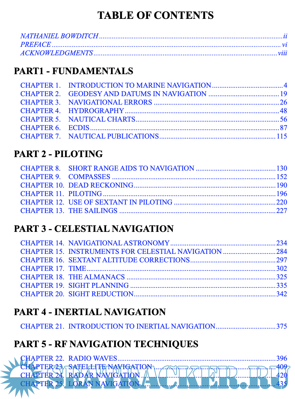 PART 6, ALTERNATIVE NAVIGATION TECH- NIQUES, addresses the topic of bathymetric navigation. This comes in direct response to several Bowditch survey responses received by NGA.