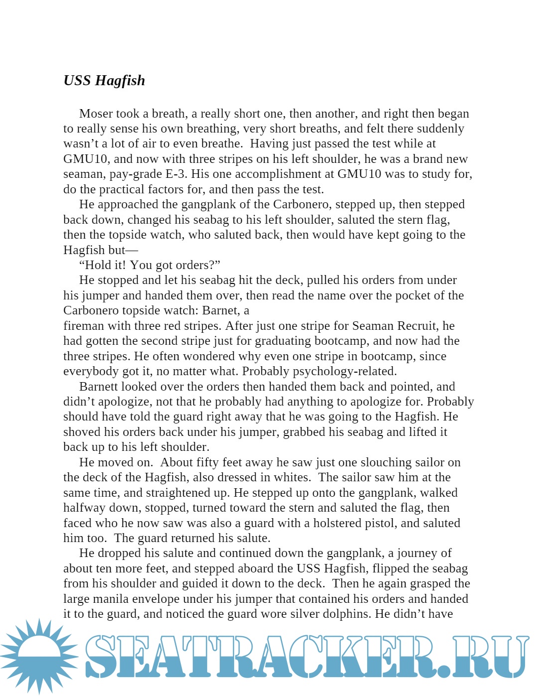 Year: 2011 Language: English Author: James W. Nelson Genre: History Edition: Kindle ISBN: 978-146325750 Format: PDF Quality: eBook Pages count: 264 Description: This is true: In the mid-nineteen-sixties some conventional fleet submarines were refitted to carry small teams of combat swimmers (Underwater Demolition Teams [UDT{also known as frogmen}] and Sea, Land and Air teams [SEALs]) for a variety of combat operations. Their primary mission was beach reconnaissance. Detachment Charlie operated from the USS Perch APSS 313 (USS Hagfish in the novel) later the USS Grayback LPSS 574, and USS Tunny LPSS 282. These submarines were left over from World War II, but all were still plenty spirited. This is fiction: This novel follows Brice Wesley Moser, a seventeen-year-old farm boy from Iowa from his induction at Des Moines, through bootcamp and Class A Weapons School at San Diego, to his first short duty at a guided missile unit at Pearl Harbor, to volunteering for submarine duty and landing on the USS Hagfish, a boat specially-fitted for hauling troops and dispersing special ops UDT and SEAL team members while submerged.
