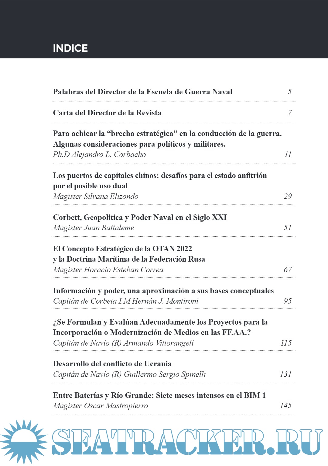 Description: La Revista de la Escuela de Guerra Naval fue creada por Orden de la Dirección Nº 18/1969 a fin de “…proveer a los oficiales superiores y jefes egresados la información de interés destinada a orientar, ampliar y/o consolidar su bagaje cultural y profesional, tomando como base los trabajos de producción original e inédita que resulten seleccionados por la dirección…”. Con el paso del tiempo y las nuevas tecnologías este ofrecimiento se hace extensivo a todos aquellos interesados en los temas del mar y en la Armada Argentina como promotora de los intereses marítimos en su más amplio alcance. Motivados por estos fines los artículos publicados en la revista de la Escuela de Guerra Naval son aprobados previamente en su pertinencia por el Consejo Editor presidido por el Director de la Escuela y diferentes miembros de la plana mayor y profesores de acuerdo con el contenido del artículo, sin perjuicio respecto de que las ideas expuestas en ellos son personales de sus autores y en consecuencia no necesariamente reflejan la opinión de la Armada Argentina, ni de la Escuela de Guerra Naval.