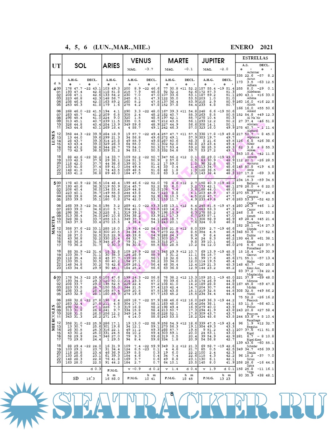 Description: Suplemento al Almanaque Naútico y Aeronaútico (Supl.H-225): publicación que contiene datos sobre las posiciones aparentes de 324 estrellas fundamentales brillantes cada diez días, las efemérides del Sol, la Lunas y cuatro planetas, el tiempo sidéreo a 0h TU y la ecuación del tiempo, junto a tabla que corrigen las observaciones y factores de conversión que agilizan los cálculos, contiene los datos necesarios para determinar la posición geográfica mediante observaciones astronómicas. Se complementa con un calendario, eclipses de Sol y de Luna, fases lunares, equinoccios y solsticios.