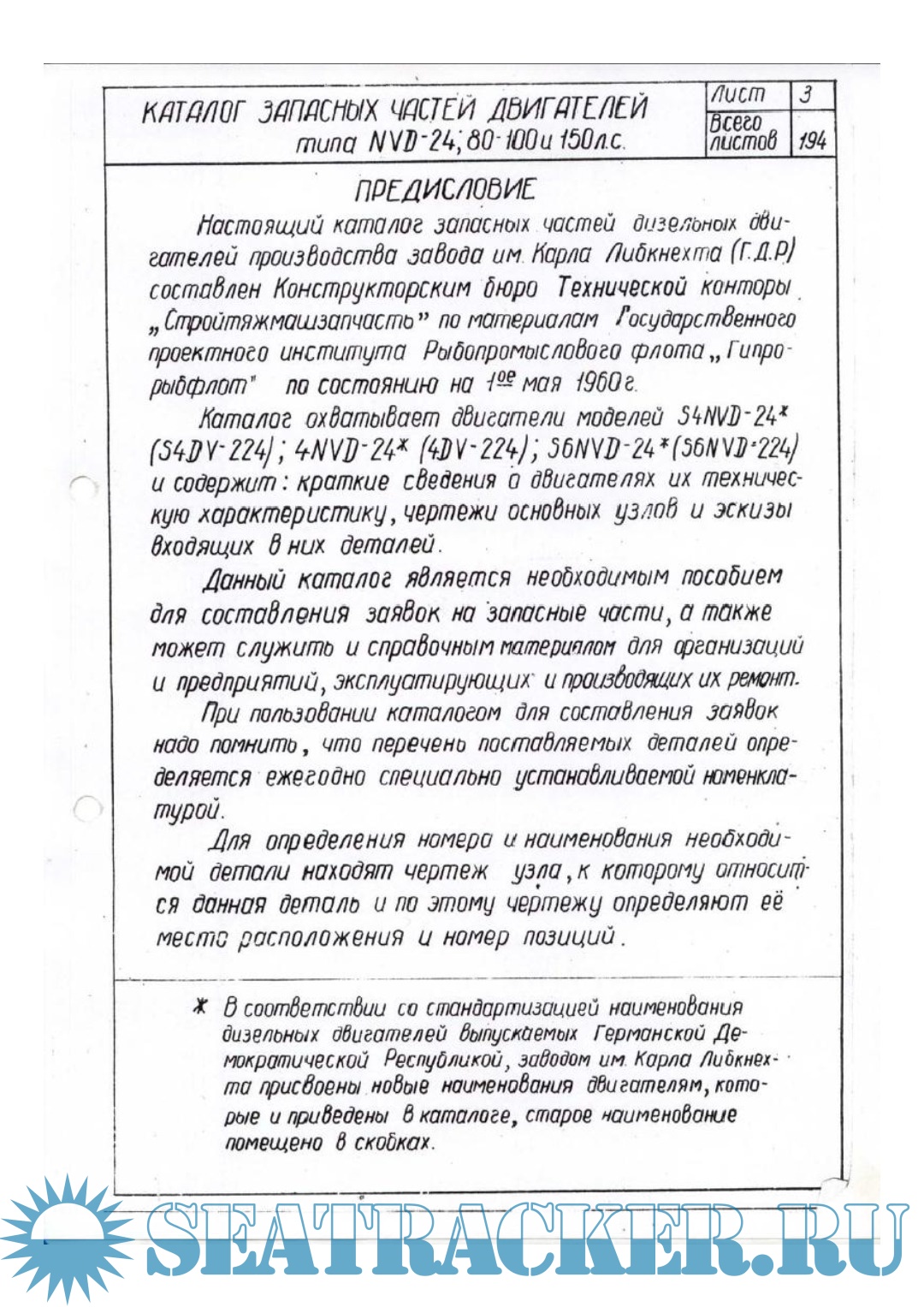 Описание: Настоящий каталог запасных частей дизельных двигателей производства завода им. Kapaa Либкнехта (1.2.2) составлен Конструкторским бюро Технической конторы „Стройтяжмашзапчасть” по материалам Государственного проектного института Рыбопромыслового флота „Гипрорыбфлот” по состоянию на 1“ мая 1960г. Каталог охватывает диапазон моделей S4 NVD-24 (S4DV- 224); 4NVD- 24 (4DV- 224); S6NVD-24 (S6NVD-224) и содержит: краткие сведения о двигателях их техническую характеристику , чертежи основных узлов и эскизы входящих в них деталей.