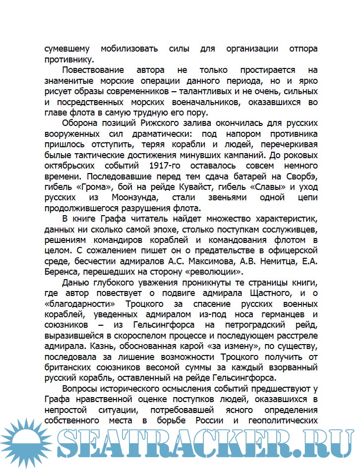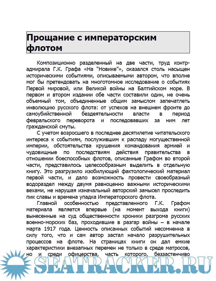 Содержание Прощание с императорским флотом (О.Г. Гончаренко) I Накануне смуты. Роль адмирала Непенина в дни кризиса. Отзвук событий на "Новике". Переворот в Гельсингфорсе. Ночь на 4 марта. Революционные интриги адмирала Максимова. Убийство адмирала Непенина. Государь император и флот. Бунт на "Андрее Первозванном". Подвиг капитана 1-го ранга Г.О. Гадда и его железная выдержка. Убийства офицеров на кораблях и берегу. Виновники крови. Ревель. Моонзунд. Кронштадт. Смерть Вирена, Бутакова и Рейна. Последние дни на "Новике" II Положение в Рижском заливе до наступления неприятеля. Гибель "Барса", "Львицы", "АГ-14", "Лейтенанта Буракова" и "Стройного". Вступление вице-адмирала М.К. Бахирева в командование Морскими силами Рижского залива. Вице-адмирал М.К. Бахирев. Гибель "Охотника". Наступление неприятеля. Действия на Кас-сарском плесе. Положение на сухопутном фронте. Сдача батарей на Сворбэ. Гибель "Грома". Бой на рейде Куйваст. Гибель "Славы". Уход из Моонзунда. Причины падения обороны Рижского залива. Жизнь "Новика" III Судовые комитеты. "Центробалт". Натравливание команд на офицеров. Снятие погон. Уничтожение званий кондукторов и сверхсрочнослужащих. Переименование кораблей. Образование союзов. Делегация офицеров у Керенского. Смещение Максимова и назначение контр-адмирала Д.Н. Вердеревского. Его конфликт с Временным правительством. Назначение А.В. Развозова. Корнилов-ское выступление. Убийство четырех офицеров "Петропавловска". Взгляд Керенского на это злодеяние. "Углублениереволюции" на флоте. Выборы в Учредительное собрание. Большевистский переворот. Гибель "Гепарда" и "Бдительного". "Морская коллегия". Модест Иванов. Упразднение должности командующего флотом. Уход Развозова, Бахирева, Беренса и других офицеров. Декрет о "красном флоте". Беспокойство команд в связи со слухами о германском десанте. Избрание вице-адмирала Развозова и его арест. Германская эскадра в Гангэ. Уничтожение "АГ-11", "АГ-12", "АГ-15", "АГ-16", "Оланда" и "Ястреба". Ультиматум об уходе из Гельсингфорса. Уничтожение английских подлодок. Переход флота в Кронштадт. Суд и казнь A.M. Щастного IV Офицерский состав флота. Его отношение к перевороту. Офицеры-ренегаты. Причины признания Временного правительства. Взаимоотношения между офицерами и матросами. Борьба за влияние на команды. Офицеры в революцию. Тип русского матроса. Его воспитание. Условия жизни и службы на корабле. Пропаганда на флоте. Аналогия между русским и французским флотами в революции. Речь эмигранта Лебедева. Взгляд матросов на революцию. Ее влияние на них. Общественное мнение о матросах. Нагорный и Седнев. Сапун. Железняков. Тип революционного матроса. Матросы как часть народа V Международное политическое положение после войны. История союза России с державами Согласия. Роль русской "общественности" в подготовке войны. Война, Россия и союзники. Требования союзников и резолюция государя императора. Участие представителей союзных держав в февральском заговоре. Сэр Джордж Бьюкэнен. Отказ представителей Англии в содействии спасению царской семьи. Деятельность союзников на юге России. Обзор состояния Черноморского флота до 18 июня 1918 г. Совещания относительно его судьбы. Виновники новороссийской трагедии. Союзники в Севастополе. Вторичный уход флота в Новороссийск. Ликвидация Севастопольской крепости и оставшихся кораблей. 