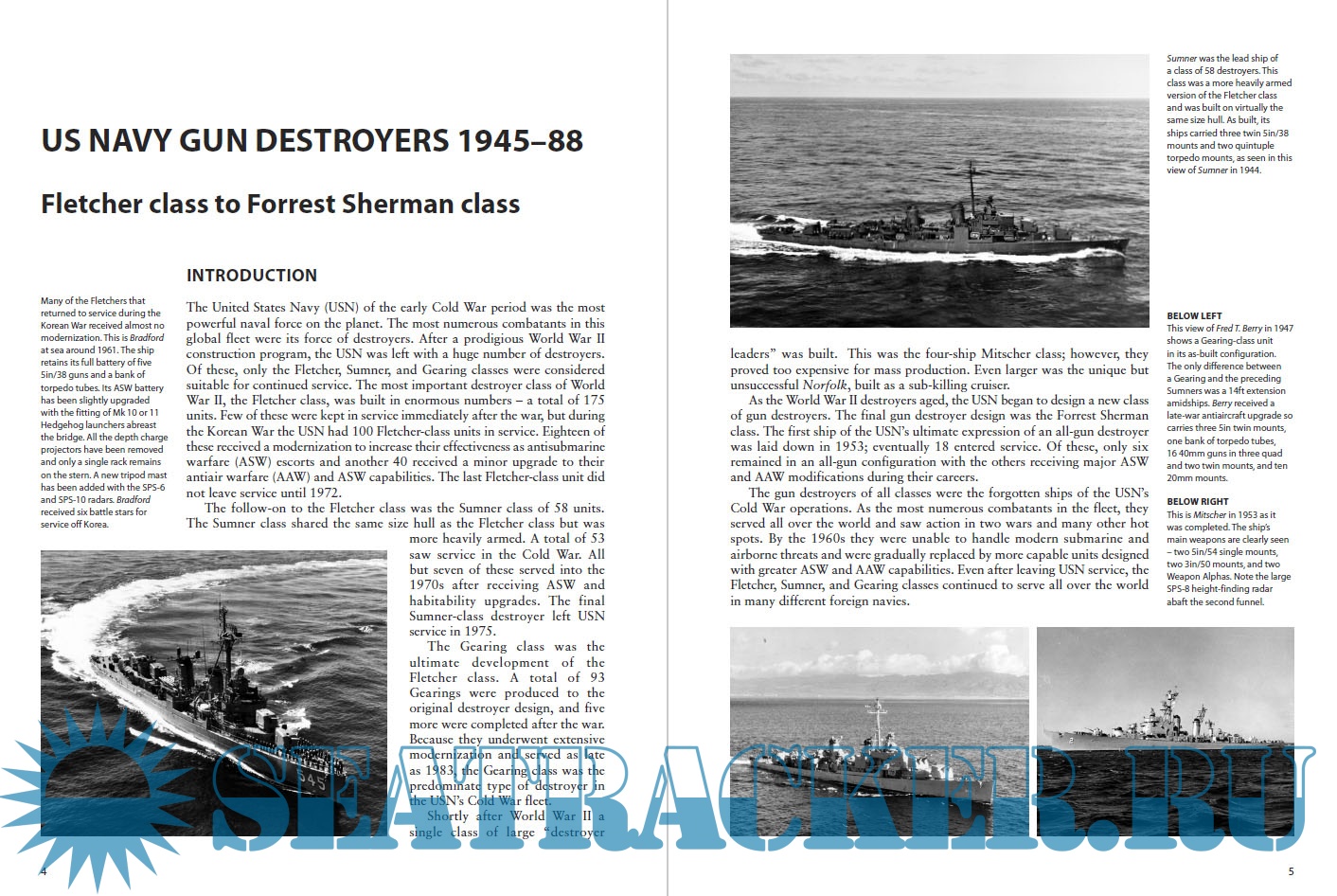 Year: 2023 Language: English Author: Mark Stille Publisher: Osprey Publishing Edition: New Vanguard, 322 Format: PDF Quality: eBook Pages count: 49 Description: An illustrated history of the long Cold War careers of the US Navy's last gun destroyers, from the modernized World War II-era Fletcher-class to the Forrest Sherman-class. The finest American destroyers of World War II had surprisingly long careers into the Cold War and the missile age. The 175-strong Fletcher-class was the largest class of US Navy destroyers ever built, and most received some modernization after World War II. A handful were converted into ASW (Anti-Submarine Warfare) escorts and one was even converted into the US Navy's first guided missile destroyer. Many Sumner-class destroyers were also kept in service, with the last decommissioned in 1973. The Gearing class was the classic US Navy wartime destroyer to have a second Cold War career, some being modified into picket ships and others into ASW escorts. Ninety-five were extensively modernized under the Fleet Modernization and Rehabilitation (FRAM) program which allowed them to serve until 1980. The majority of these ships then saw service with foreign navies. However the story of Cold War gun destroyers is not just one of World War II relics. Commissioned in the 1950s, the 18 ships of the Forrest Sherman class were the US Navy's last all-gun destroyers, and were considered to be the pinnacle of US Navy gun-destroyer design. Later in their careers, most were modernized for ASW and antiair warfare. The virtually unknown Norfolk class was originally built as a destroyer leader and maximized for ASW but only two were modernized and the other three retired early. Many of these ships, such as USS Edson, Cassin Young, and Turner Joy, still survive as museum ships today. Using battlescene artwork, detailed illustrations and photos, this book explores the careers, modernizations, and roles of all these unsung Cold War stalwarts, the last gun destroyers of the US Navy.
