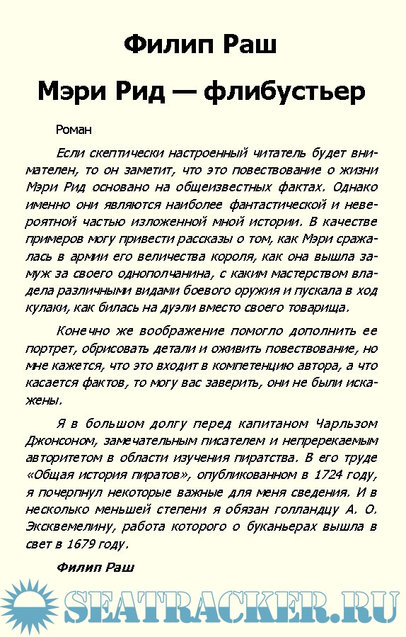 Год выпуска: 2008 Язык: Русский Автор: Раш Филип, Шэй Фрэнк Жанр: Художественная литература Издательство: ВЕЧЕ Издание: Морской авантюрный роман Формат: FB2 Качество: Изначально компьютерное (eBook) Количество страниц: 615 Описание: Два романа, вошедшие в эту книгу, повествуют о необычных женщинах-пиратках, чьи судьбы тесно переплелись. Мэри Рид и Энн Бонни, бороздившие моря, грабившие суда, до конца испытали фортуну и приняли ниспосланную им участь. Романы удачно дополняют друг друга, по-разному трактуя события в жизни знаменитых морских разбойниц.