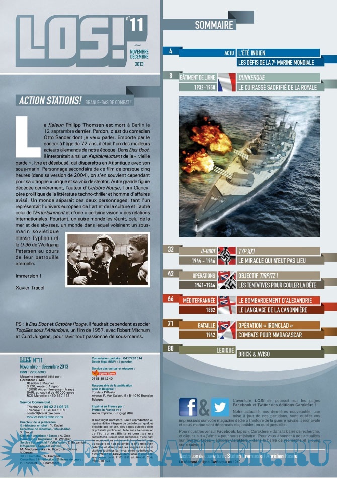 Description: LES ÉDITIONS CARAKTÈRE PRENNENT LE LARGE EN LANÇANT UN NOUVEAU MAGAZINE CONSACRÉ À LA GUERRE NAVALE !Les sujets passionnants ne manquent pas et LOS ! met un point d’honneur à les présenter au lecteur comme cela n’a jamais été fait dans la presse française jusqu’à présent. Un seul mot d’ordre pour l’équipe rédactionnelle : rigueur scientifique et présentation ludique !S’appuyant sur un fond photographique d’exception, sur des plans de bateaux et d’avions, les éditions Caraktère innovent une fois de plus en vous proposant aussi des vues 3D détaillées, le tout au service de textes soigneusement rédigés par des auteurs spécialisés. Vous comprendrez ainsi comment fonctionne un submersible, comment se déroule un combat naval, comment est conçu un cuirassé ou comment attaquent les avions-torpilleurs !Revivez au fil des pages l’aventure humaine exceptionnelle des matelots de la marine marchande affrontant les U-Boote en Arctique, ou celle des pilotes embarqués sur les porte-avions américains et japonais. Lisez les exploits des hommes-grenouilles italiens en Méditerranée, des équipages des vedettes lance-torpilles dans la Manche, des sous-marins soviétiques de la guerre froide ou des grands cuirassés de 1914-18