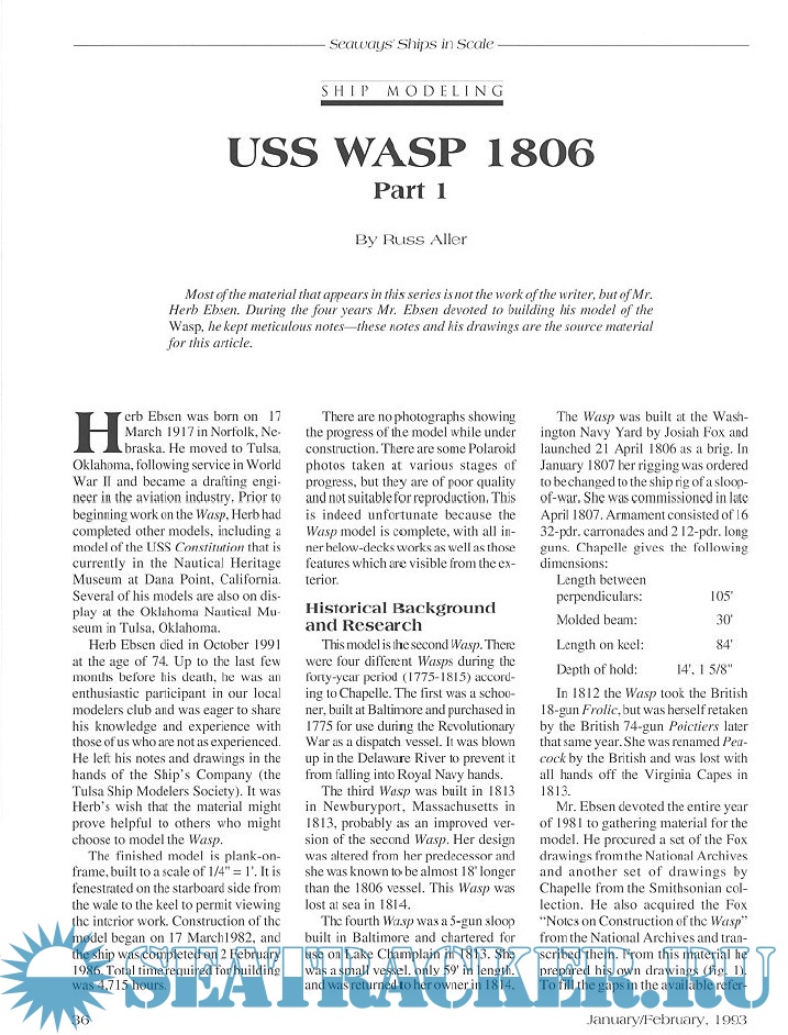 Year: 1993 Language: English Author: Scottie Dayton (Editor) Genre: Periodical (magazine) Edition: 1993-1 Format: PDF Quality: eBook Pages count: 76 Description: Seaway is the home port for Seaways Ships in Scale magazine, the leading workshop and research magazine for the ship modeler. In the magazine we explore all levels of modeling experience, all types of ships, all kinds of models, all historical eras and all construction materials