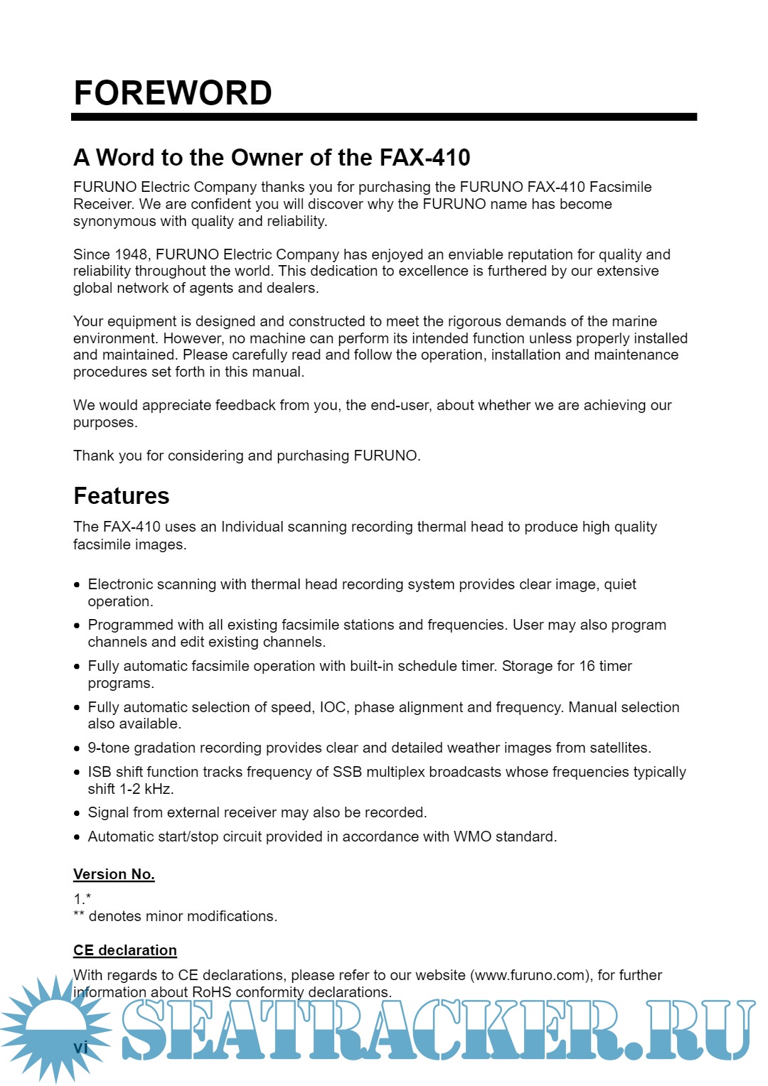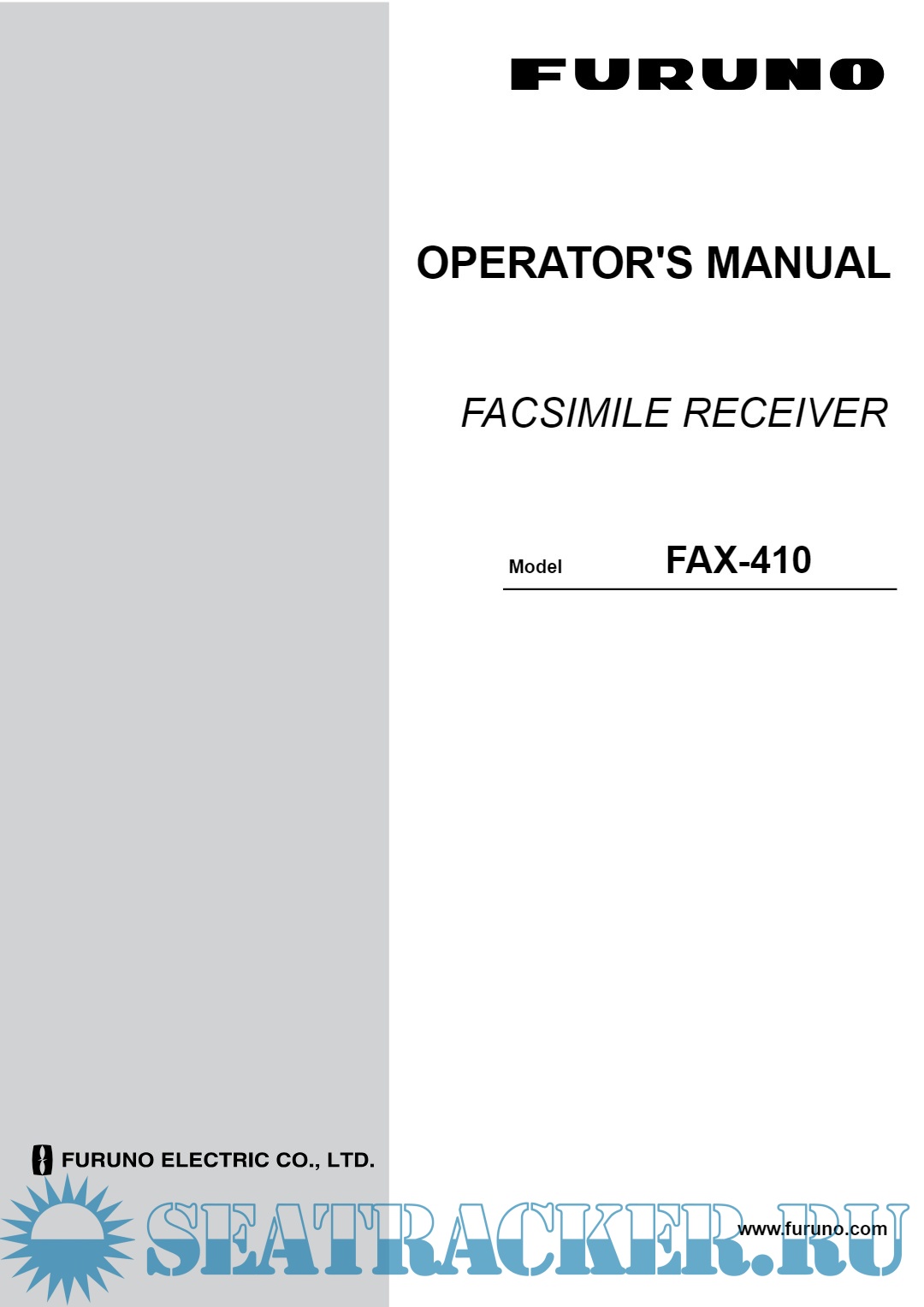 Description: This Operator's manual describes precautions, operations and troubleshooting of FURUNO Facsimile Receiver FAX 410