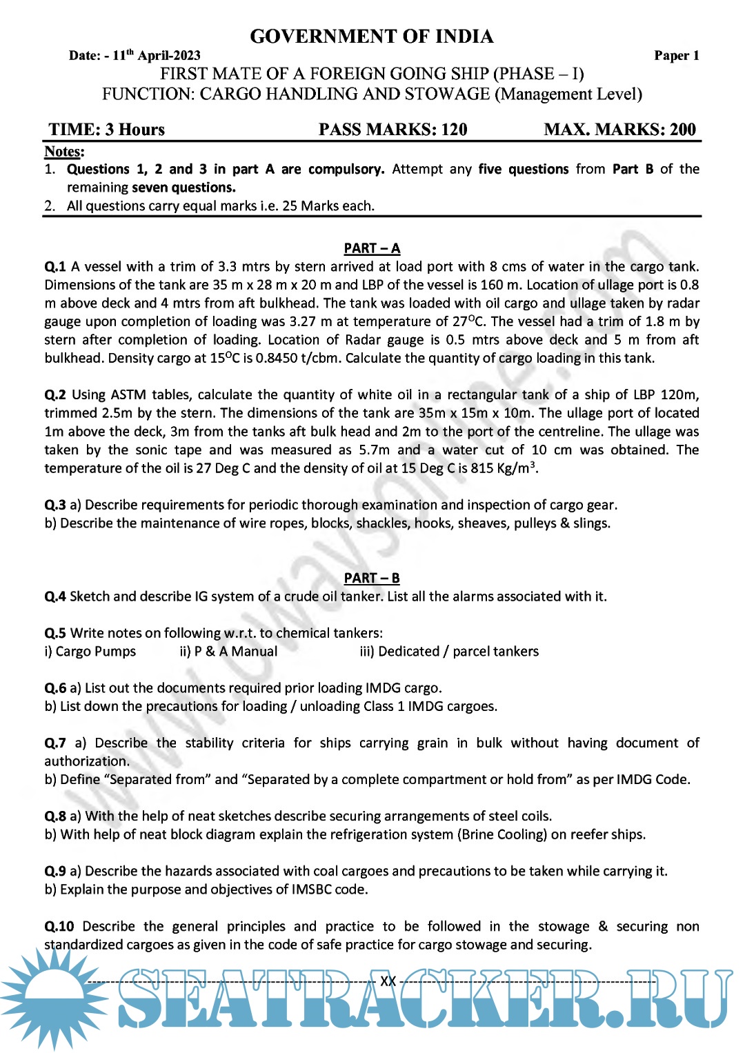 Description: Question Paper Set for Phase I (Chief Mate F.G.) Mercantile Marine Department (MMD), India Examination