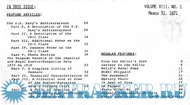 Year: 1971 Language: English Author: Edward C. Fisher (Editor) Genre: Periodical publication Edition: 1971-1 Format: PDF Quality: Scanned pages Pages count: 117 Description: From a small beginning in 1964, this quarterly journal has become internationally recognized as the most authoritative English-language publication in the warship field. Each issue averages 100 pages, with fact-filled articles, mainly but not exclusively the original work of our members. Subjects cover all navies and all types of ships from about 1860 to date, liberally illustrated with photographs which are highly praised for their quality, many of which have rarely been printed before, and with excellent line drawings and plans-a valuable resource for ship modelers.