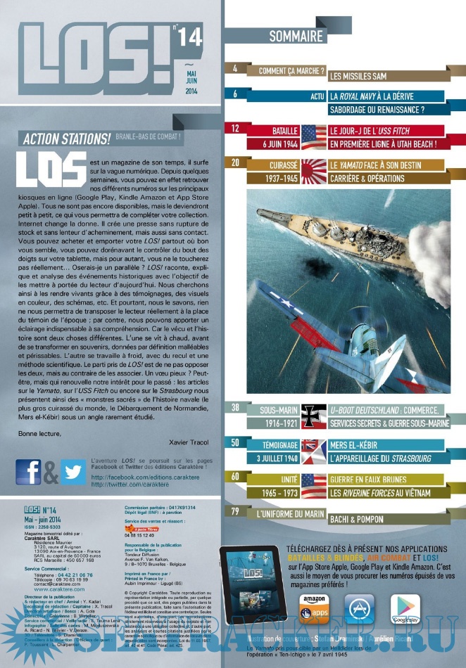 Description: LES ÉDITIONS CARAKTÈRE PRENNENT LE LARGE EN LANÇANT UN NOUVEAU MAGAZINE CONSACRÉ À LA GUERRE NAVALE !Les sujets passionnants ne manquent pas et LOS ! met un point d’honneur à les présenter au lecteur comme cela n’a jamais été fait dans la presse française jusqu’à présent. Un seul mot d’ordre pour l’équipe rédactionnelle : rigueur scientifique et présentation ludique !S’appuyant sur un fond photographique d’exception, sur des plans de bateaux et d’avions, les éditions Caraktère innovent une fois de plus en vous proposant aussi des vues 3D détaillées, le tout au service de textes soigneusement rédigés par des auteurs spécialisés. Vous comprendrez ainsi comment fonctionne un submersible, comment se déroule un combat naval, comment est conçu un cuirassé ou comment attaquent les avions-torpilleurs !Revivez au fil des pages l’aventure humaine exceptionnelle des matelots de la marine marchande affrontant les U-Boote en Arctique, ou celle des pilotes embarqués sur les porte-avions américains et japonais. Lisez les exploits des hommes-grenouilles italiens en Méditerranée, des équipages des vedettes lance-torpilles dans la Manche, des sous-marins soviétiques de la guerre froide ou des grands cuirassés de 1914-18