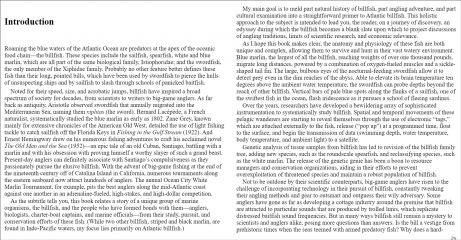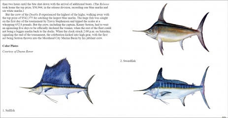 Description: The billfish is fixed at the apex of the oceanic food chain. Composed of sailfish, marlin, spearfish, and swordfish, they roam the pelagic waters of the Atlantic and are easily recognized by their long, spear-like beaks. Noted for their speed, size, and acrobatic jumps, billfish have for centuries inspired a broad spectrum of society. Even in antiquity, Aristotle, who assiduously studied the swordfish, named this gladiator of the sea xiphias - the sword.