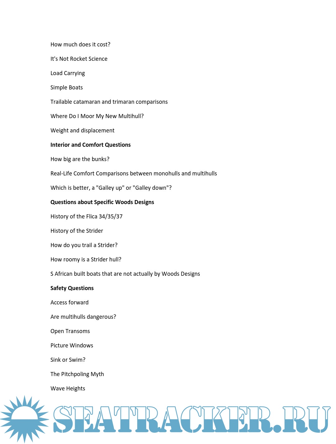 Year: 2024 Language: English Author: www.sailingcatamarans.com Genre: Manual Publisher: www.sailingcatamarans.com Format: PDF Quality: eBook Pages count: 60 Description: Many people ask me the same questions. I have listed the most popular here, which I have divided into sections to try to make it easier for you to find the answers you are looking for. Note: This list of FAQ's was first uploaded in 2001, but has been edited and added to over the years