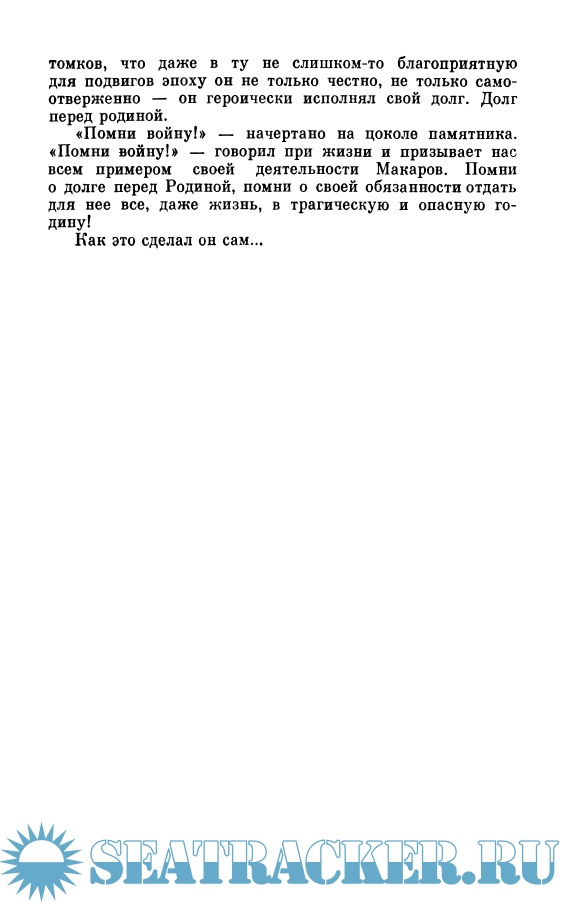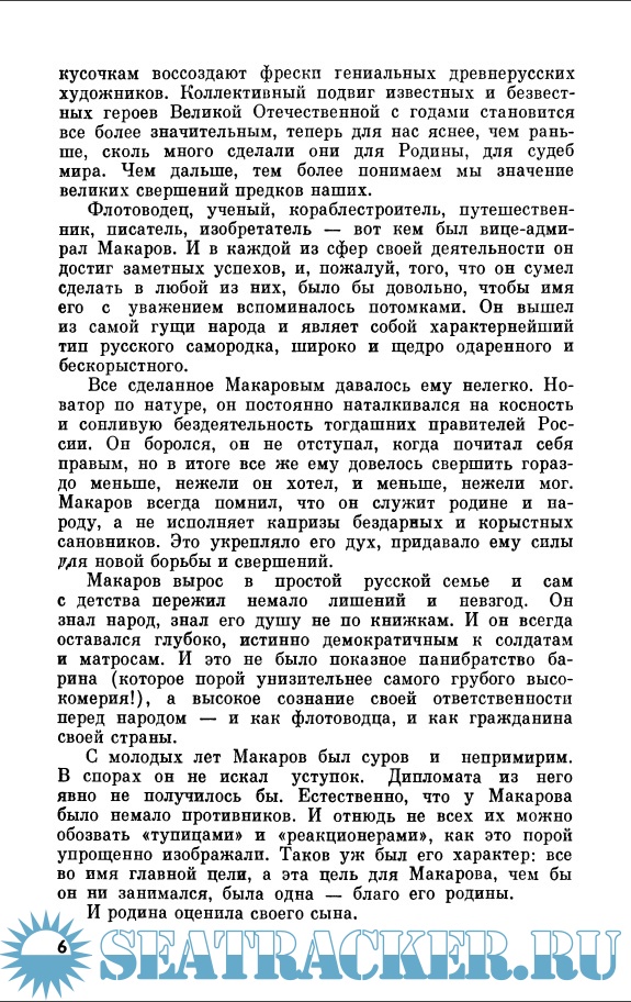 Описание: Книга рассказывает о жизни и деятельности выдающегося флотоводца, ученого, кораблестроителя, путешественника, изобретателя - Степана Осиповича Макарова. Макаров разработал теорию непотопляемости корабля и был создателем знаменитого ледокола "Ермак". Его перу принадлежит книга о морской тактике и географические исследовательские работы.