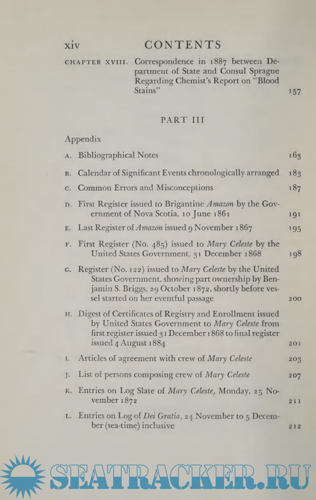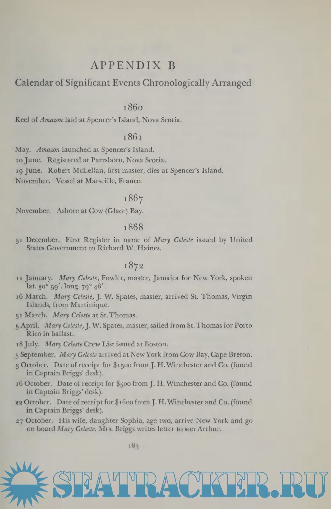 Year: 1942 Language: English Author: Fay C.E. Publisher: Peabody Museum Format: PDF Quality: eBook Pages count: 324 Description: For almost threescore years and ten, the story of the Mary Celeste—a small, seaworthy, American half-brig found wandering, ghostlike, without master or crew, over the waters between the Azores and the coast of Portugal—has continued to allure the interest of people all over the world, and to excite seemingly endless speculation on the part of “those who go down to the sea in ships.”