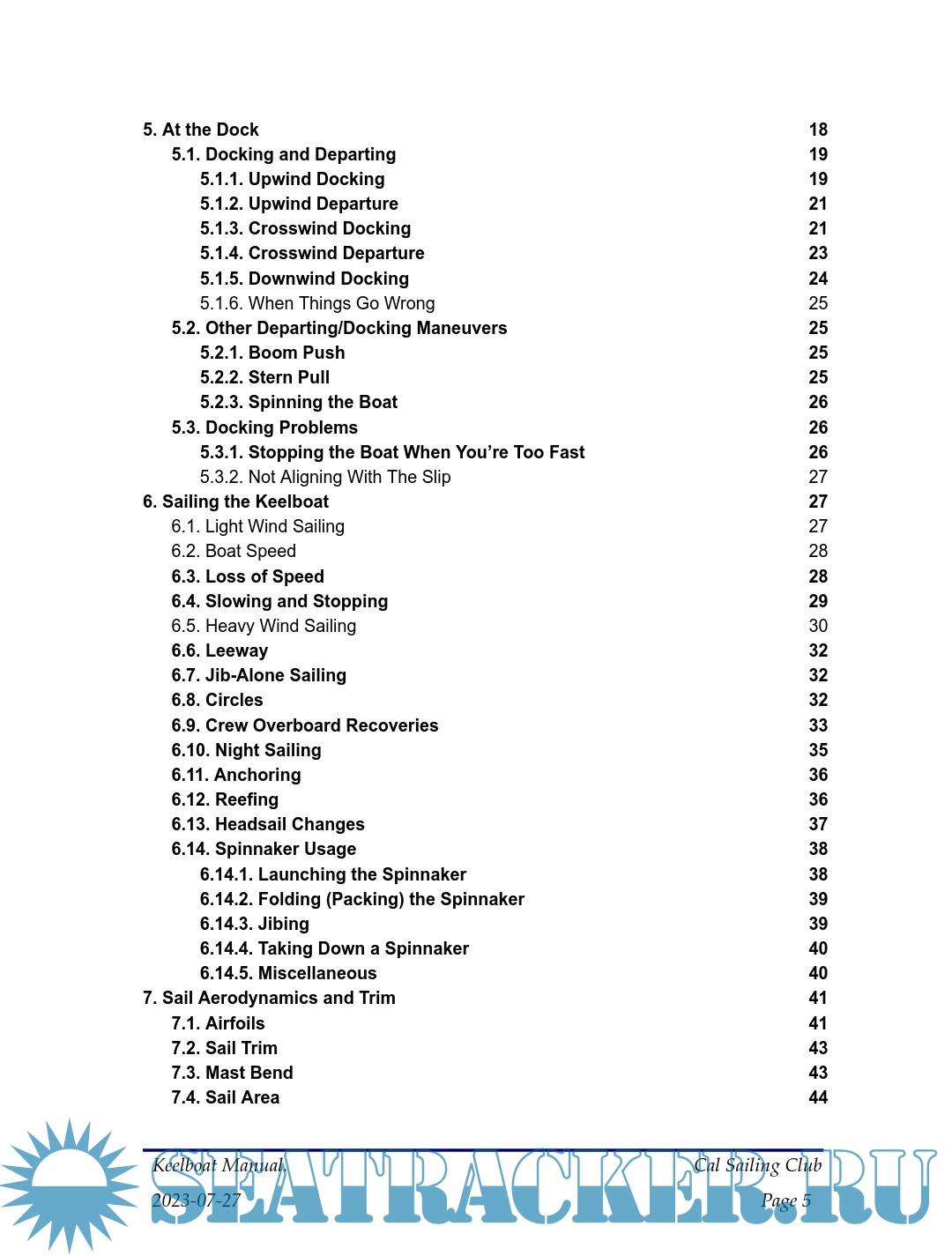 Year: 2023 Language: English Author: Burchik S. at all Genre: Manual Publisher: Cal Sailing Club Format: PDF Quality: eBook Pages count: 61 Description: So you’ve been messing about in dinghies for a while and have your Junior rating and you feel it’s time to start sailing on the keelboats. This is intended to be a guide to get you started, and also as a reference as you go through the CSC keelboat lesson series or when geęing private instruction. The material covered in this manual will continue to build on the basics learned in dinghies, with aęention called to some of the big differences between the two. A keelboat is slower to respond, has a greater turning radius and, with a large mass, momentum will be a big factor in how the boat behaves. The fundamentals are not going to be covered here, as they are thoroughly discussed in Colgate and other basic sailing books listed at the end of this manual. The most important skills to be learned are: recognizing what the boat will be doing before it happens and planning maneuvers before executing them. Having a thorough understanding of basic sail mechanics will also be a good starting point for learning to sail keelboats.