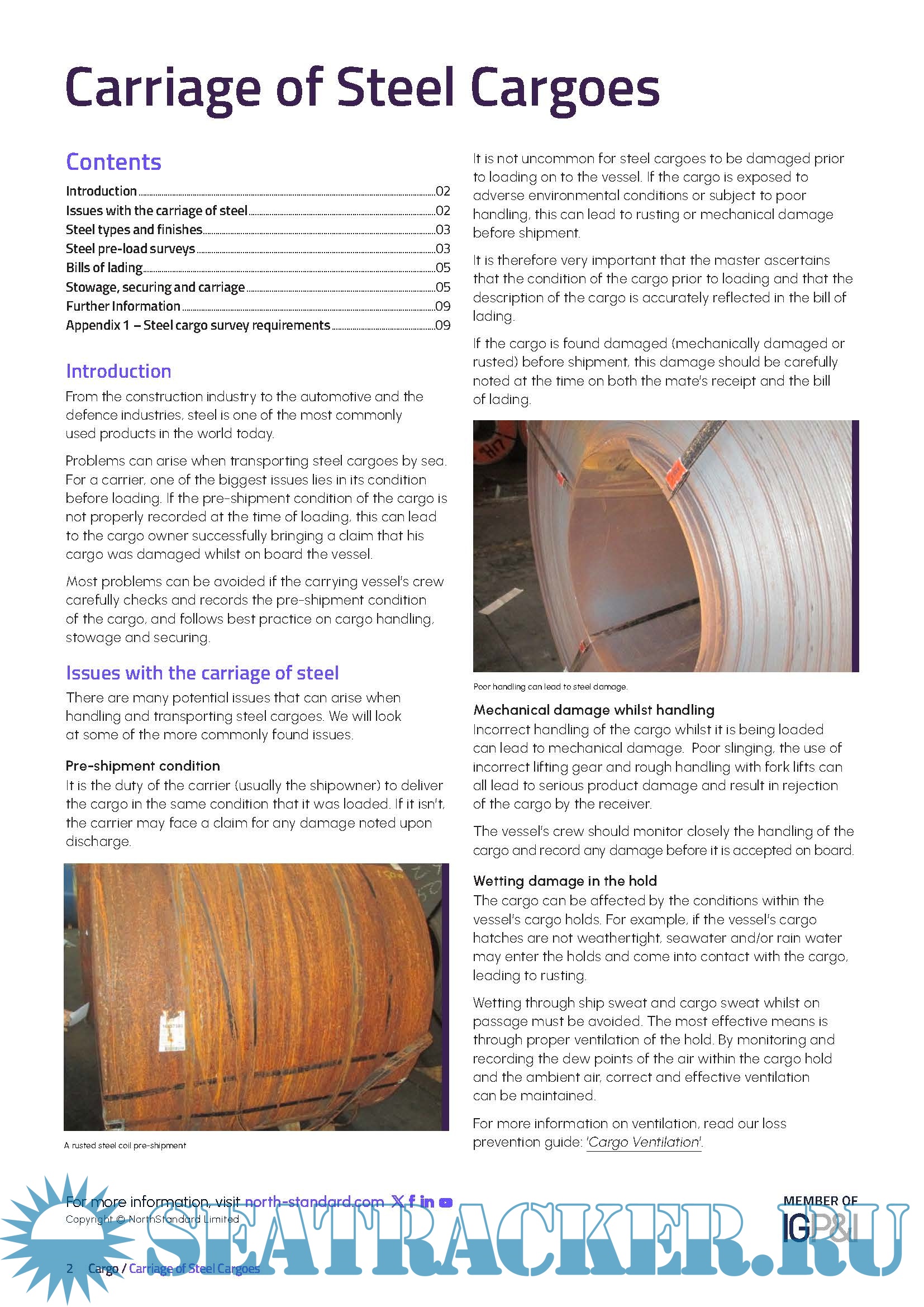 Year: 2024 Language: English Author: NorthStandard Genre: Guide Edition: September 2024 Format: PDF Quality: eBook Pages count: 11 Description: From the construction industry to the automotive and the defence industries, steel is one of the most commonlyused products in the world today. Problems can arise when transporting steel cargoes by sea. For a carrier, one of the biggest issues lies in its condition before loading. If the pre-shipment condition of the cargo is not properly recorded at the time of loading, this can lead to the cargo owner successfully bringing a claim that his cargo was damaged whilst on board the vessel. Most problems can be avoided if the carrying vessel’s crew carefully checks and records the pre-shipment condition of the cargo, and follows best practice on cargo handling, stowage and securing.