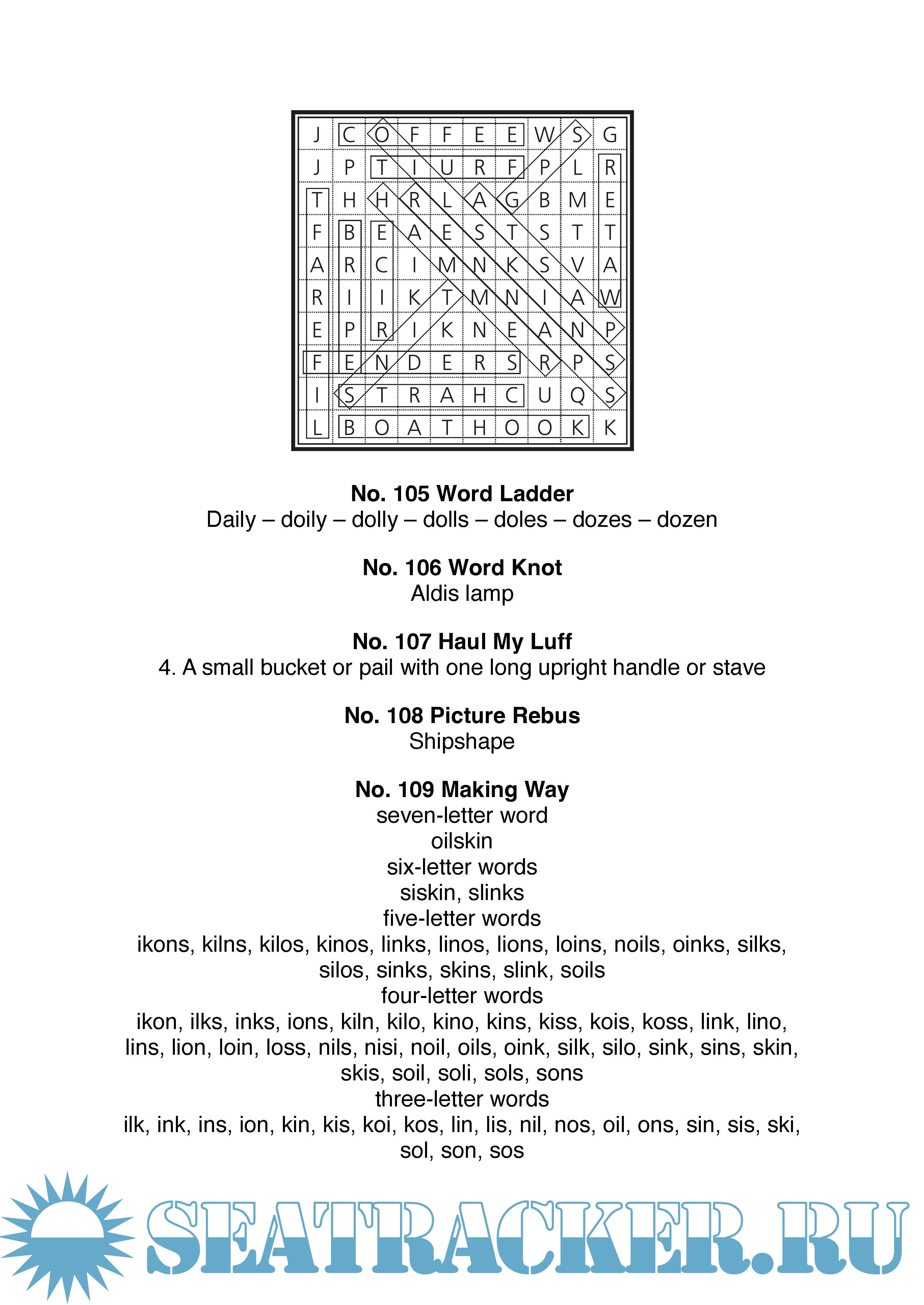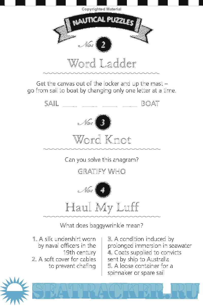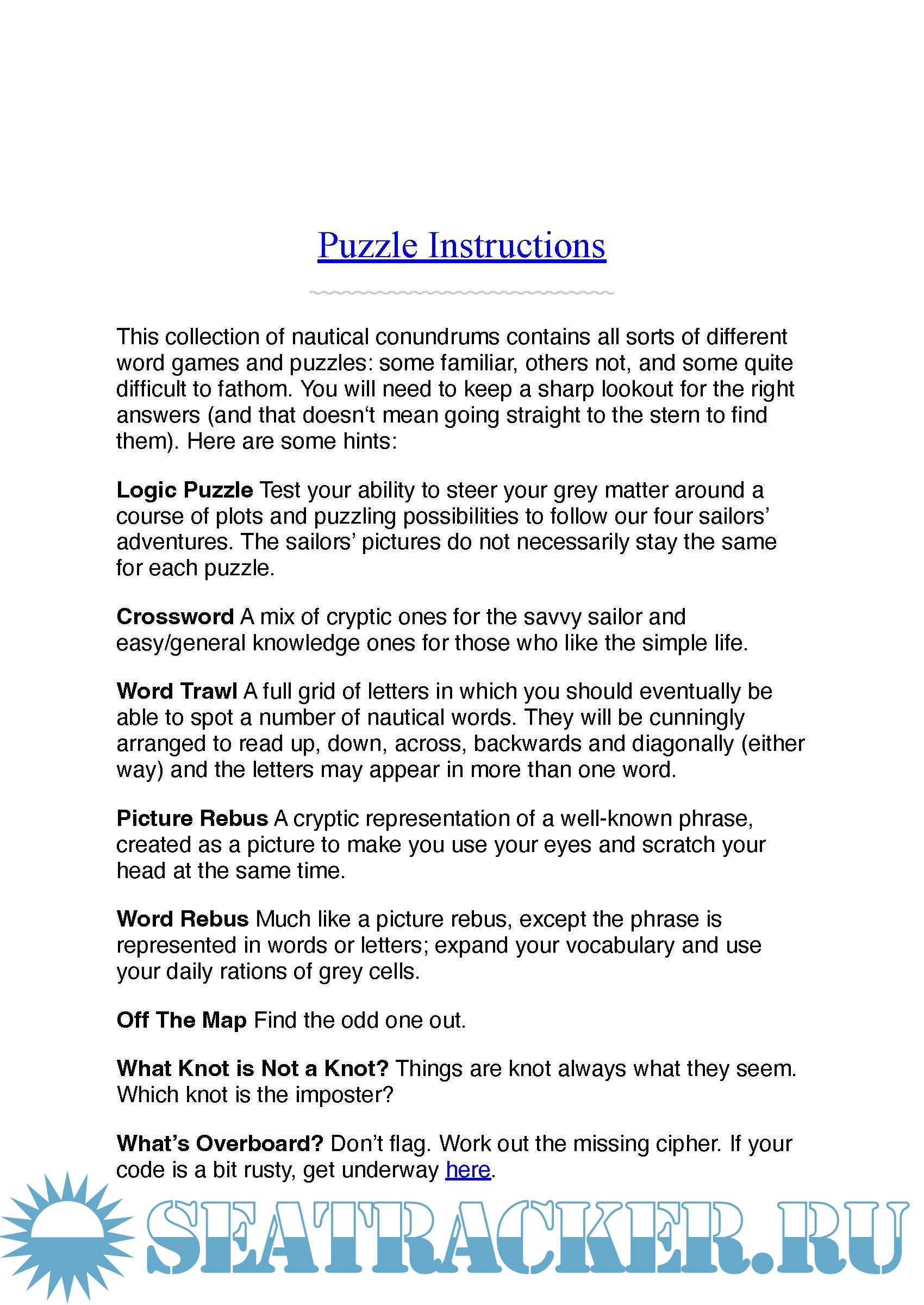Year: 2014 Language: English Author: Judith Chamberlain-Webber Genre: Other Publisher: Bloomsbury Publishing Edition: 1st ISBN: 9781472913517 Format: PDF, EPUB Quality: eBook Pages count: 225 Description: The Adlard Coles Nautical Puzzle Book packed with brainteasers, conundrums and other puzzles, this nautical-themed collection is ideal for a storm-bound day in harbor and perfect for the cosy evenings aboard or ashore. The Adlard Coles Nautical Puzzle Book is the ideal shipmate for all salty dogs, be they round-the-world racers, dinghy dabblers or armchair pirates. It's packed with 200 nautically-themed brain-teasers designed to shiver the mental timbers. Test everyone's wits on a treasure chest of marine conundrums, crosswords, code breakers, anagrams, word puzzles, riddles, word chains, logic puzzles, word searches, missing links, odd one out, what comes next, and opposites and keep the whole crew entertained on weather-bound days in harbour. - Pirate crosswords - Word ladders - Odd man out - Word wheels - Missing links - Anagrams Additional info: