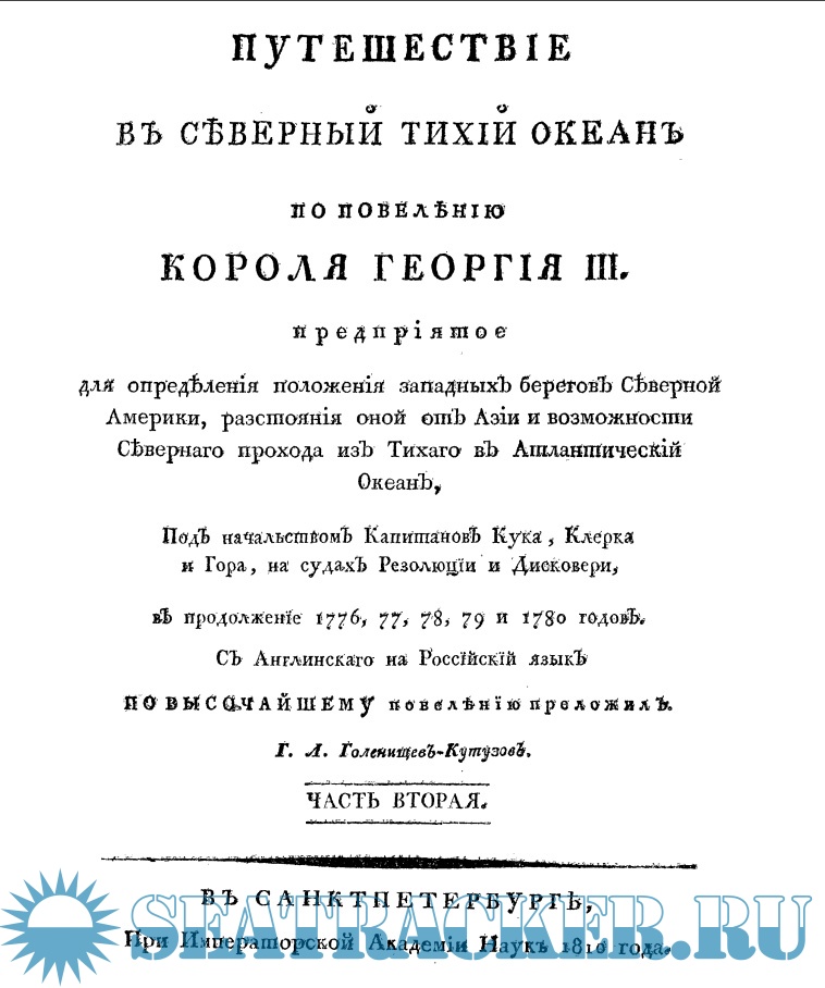 Описание: Путешествие в Северный Тихий океан по повелению короля Георгия III предприятое для определения положения западных берегов Северной Америки, разстояния оной от Азии и возможности северного прохода из Тихаго в Атлантический океан, под начальством капитанов Кука, Клерка и Гора, на судах Резолюции и Дисковери, в продолжение 1776, 77, 78, 79 и 1780 годов