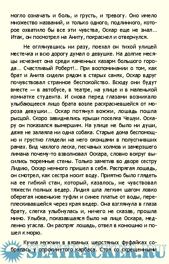 Описание: Начиналось все почти как классическая сказка о Золушке, но в мужском варианте - брат обеспечивает нужды не только еще не старых родителей, но и сестру, которая уже не знает, какую еще обновку приобрести и брата, который учится в Риге, носит "городские" костюмы и конечно же на работу у него нет времени. Сам же главный герой, Оскар Клява, привык каждый день выходить в море, носить промасленную куртку и латать старые сапоги. Тяжелый, однообразный, а местами и вовсе трагический быт рыбачьей деревни, конечно, показан с почти этнографической достоверностью, включая пьянство, постоянные ссоры, вранье и нищету. На этом фоне Оскар выглядит как-то чересчур идеальным - почти не пьет, в конфликты до последнего не встревает, живет без долгов... Натурально, сказочный герой!