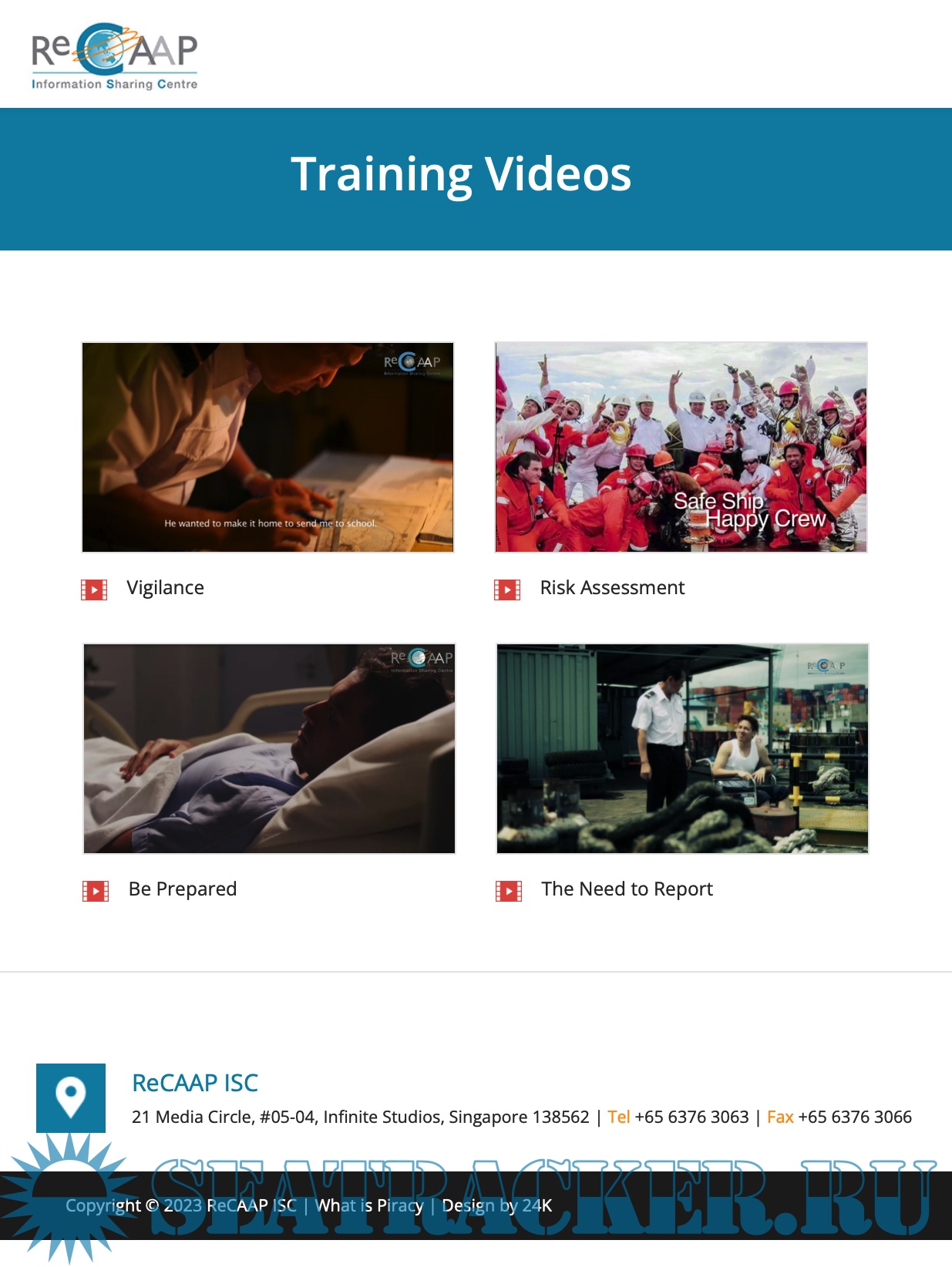 Year: 202x Author: ReCAAP Language: English Genre: Training Video Playtime: Multiple Quality: HDRip Format: MP4 Video codec: AVC/H.264 Audio codec: AAC Video: 1920x1080 25 fps Audio: 320 Kbps / 48.0 KHz Description: Piracy and Armed Robbery against Ships in Asia Training Videos produced by Regional Cooperation Agreement on Combating Piracy and Armed Robbery against Ships in Asia (ReCAAP) with the following contents: - Vigilance - Risk Assessment - Be Prepared - The Need to Report
