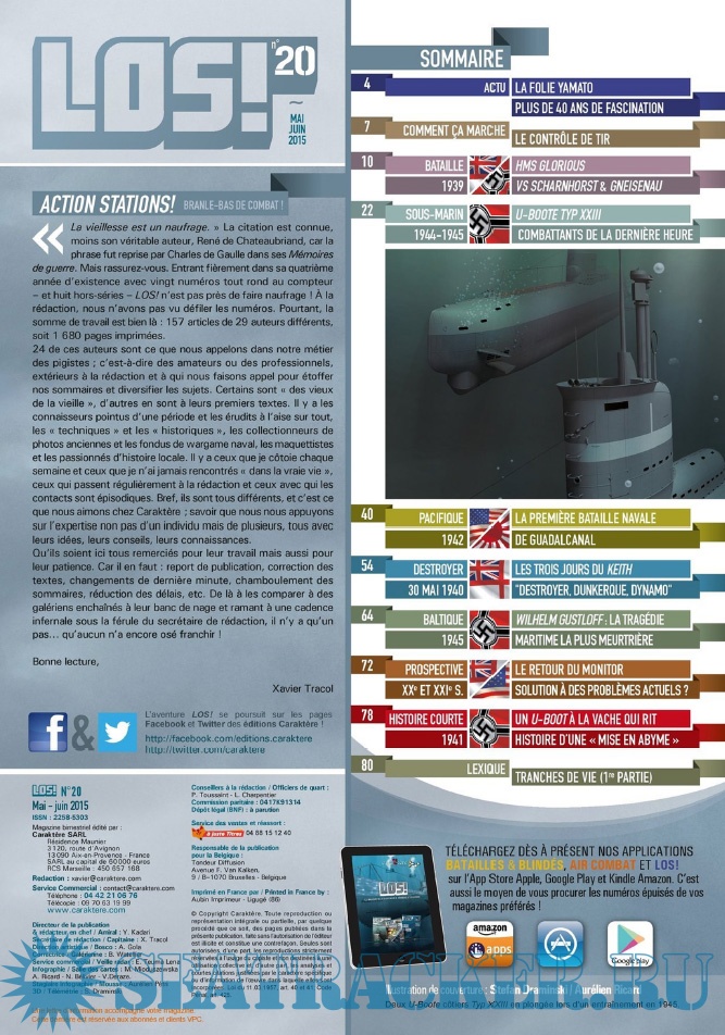 Description: LES ÉDITIONS CARAKTÈRE PRENNENT LE LARGE EN LANÇANT UN NOUVEAU MAGAZINE CONSACRÉ À LA GUERRE NAVALE !Les sujets passionnants ne manquent pas et LOS ! met un point d’honneur à les présenter au lecteur comme cela n’a jamais été fait dans la presse française jusqu’à présent. Un seul mot d’ordre pour l’équipe rédactionnelle : rigueur scientifique et présentation ludique !S’appuyant sur un fond photographique d’exception, sur des plans de bateaux et d’avions, les éditions Caraktère innovent une fois de plus en vous proposant aussi des vues 3D détaillées, le tout au service de textes soigneusement rédigés par des auteurs spécialisés. Vous comprendrez ainsi comment fonctionne un submersible, comment se déroule un combat naval, comment est conçu un cuirassé ou comment attaquent les avions-torpilleurs !Revivez au fil des pages l’aventure humaine exceptionnelle des matelots de la marine marchande affrontant les U-Boote en Arctique, ou celle des pilotes embarqués sur les porte-avions américains et japonais. Lisez les exploits des hommes-grenouilles italiens en Méditerranée, des équipages des vedettes lance-torpilles dans la Manche, des sous-marins soviétiques de la guerre froide ou des grands cuirassés de 1914-18