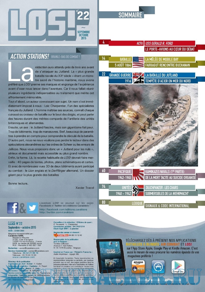Description: LES ÉDITIONS CARAKTÈRE PRENNENT LE LARGE EN LANÇANT UN NOUVEAU MAGAZINE CONSACRÉ À LA GUERRE NAVALE !Les sujets passionnants ne manquent pas et LOS ! met un point d’honneur à les présenter au lecteur comme cela n’a jamais été fait dans la presse française jusqu’à présent. Un seul mot d’ordre pour l’équipe rédactionnelle : rigueur scientifique et présentation ludique !S’appuyant sur un fond photographique d’exception, sur des plans de bateaux et d’avions, les éditions Caraktère innovent une fois de plus en vous proposant aussi des vues 3D détaillées, le tout au service de textes soigneusement rédigés par des auteurs spécialisés. Vous comprendrez ainsi comment fonctionne un submersible, comment se déroule un combat naval, comment est conçu un cuirassé ou comment attaquent les avions-torpilleurs !Revivez au fil des pages l’aventure humaine exceptionnelle des matelots de la marine marchande affrontant les U-Boote en Arctique, ou celle des pilotes embarqués sur les porte-avions américains et japonais. Lisez les exploits des hommes-grenouilles italiens en Méditerranée, des équipages des vedettes lance-torpilles dans la Manche, des sous-marins soviétiques de la guerre froide ou des grands cuirassés de 1914-18
