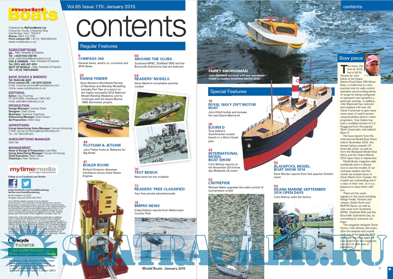 Description: Model Boats magazine is a practical and informative read for those with a love for the hobby. It covers the latest news and views from the various clubs and associations around the country, useful hints, tips and step by step guides for those interested in the art of constructing a model boat as well as tests and recommendations of new boats and tools. Floating along behind these are great special features examining in depth different models from narrowboat to destroyer!