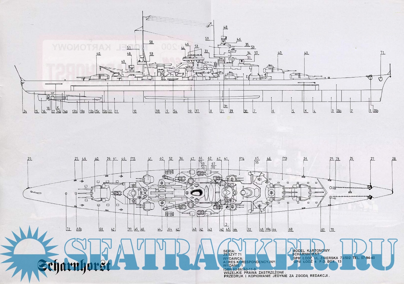 18 листов цветных выкроек и инструкций для изготовления бумажной модели немецкого крейсера Scharnhorst в масштабе 1:200Скриншоты