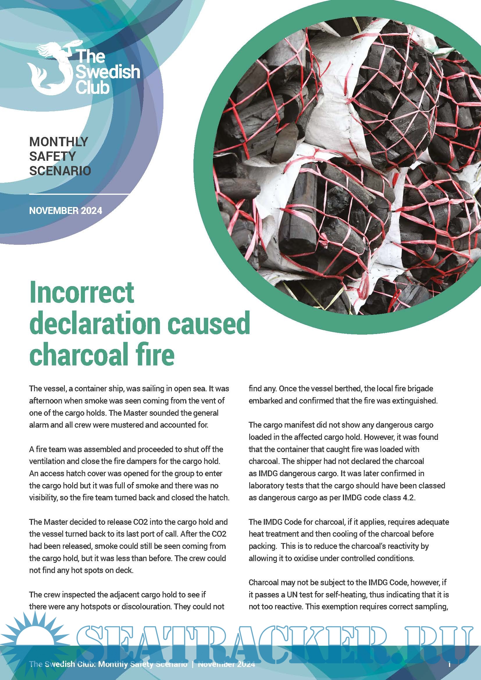 Year: 2024 Language: English Author: the Swedish Club Genre: Periodical publication Edition: November 2024 Format: PDF Quality: eBook Pages count: 3 Description: The Club is publishing, on a monthly basis, a new Monthly Safety Scenario (MSS) to assist owners in their efforts of complying with the above regulations. Alternative scenarios will be uploaded in SCOL. It is easy to download the MSS and enter the written conclusions from the meeting and send feedback to the shore-based organisation. Issue November, 2024 | Incorrect declaration caused charcoal fire. Under the ISM requirement, owners are obliged to carry out monthly safety meetings or safety committee meetings onboard their vessels. This obligation stems from Chapter 5 of the ISM Code: “Master’s responsibility and authority” and furthermore from “5.1.2, motivating the crew in the observation of that policy.