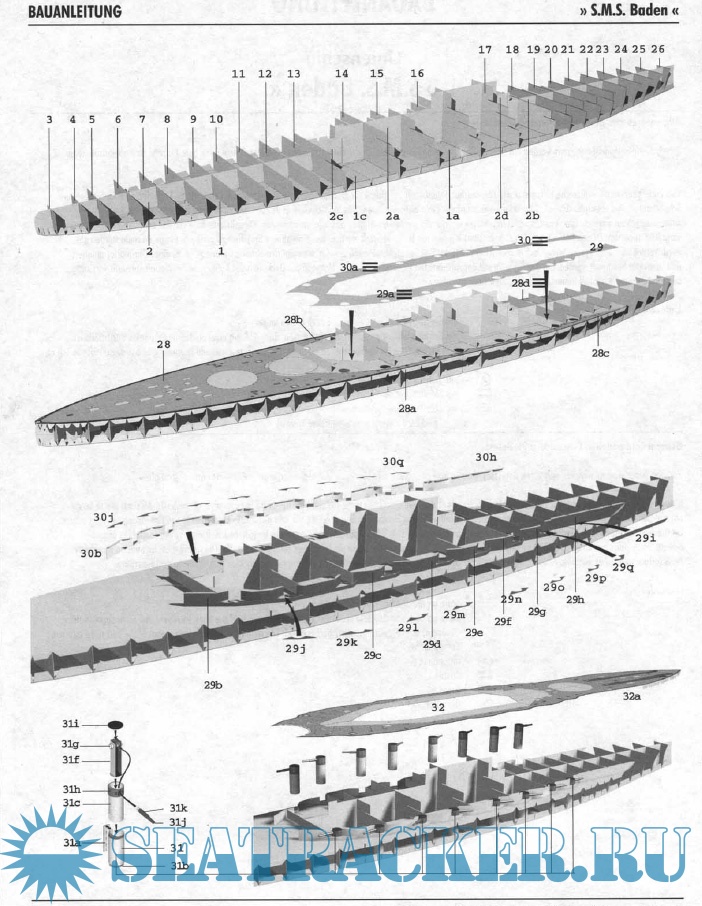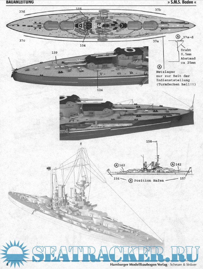 37 листов цветных выкроек и инструкций для изготовления бумажной модели германского линкора SMS Baden 1916 год в масштабе 1:250Скриншоты