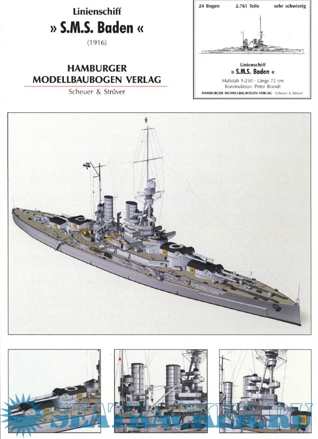 Описание: 37 листов цветных выкроек и инструкций для изготовления бумажной модели германского линкора SMS Baden 1916 год в масштабе 1:250