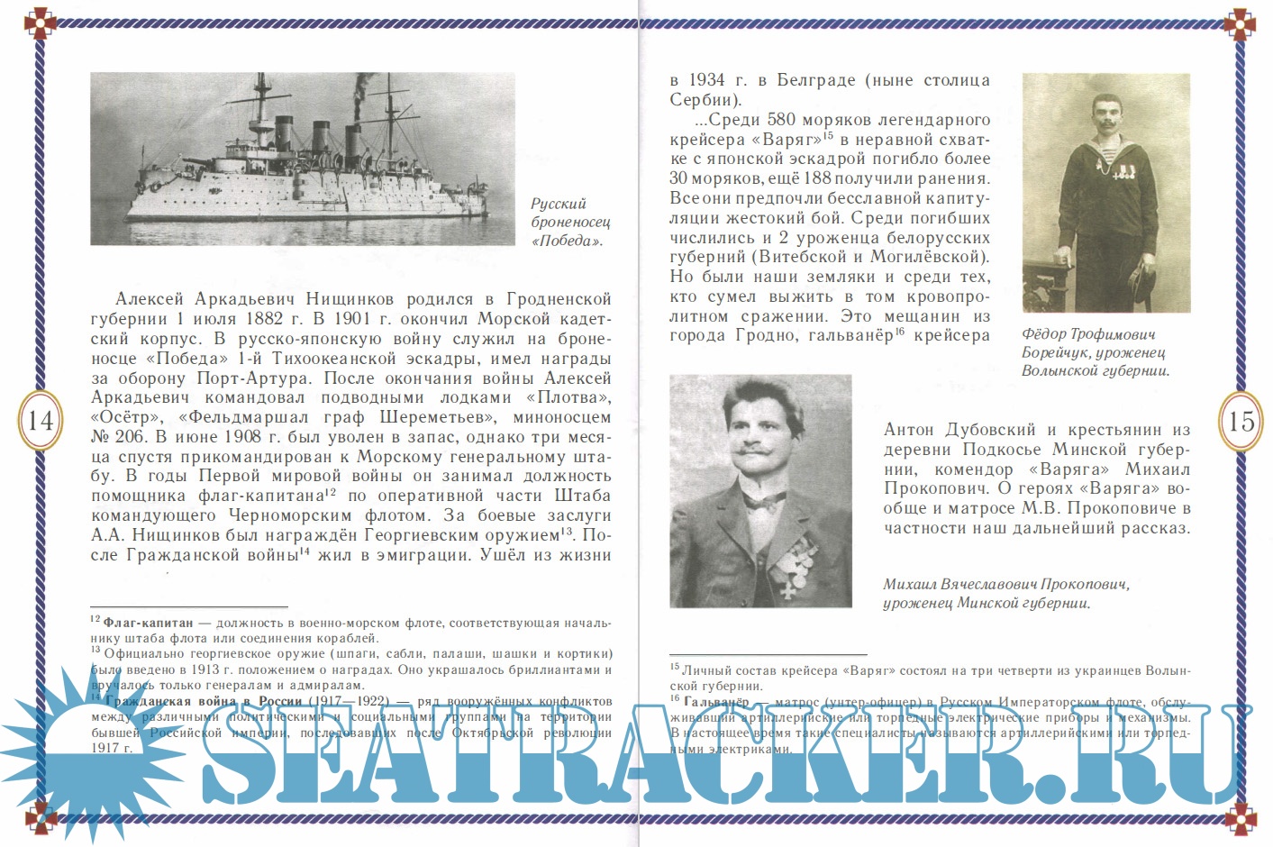 Описание: В книге рассказывается, как 110 лет назад команды легендарного крейсера «Варяг» и канонерской лодки «Кореец» вступили в смертельную схватку с превосходящими силами японской эскадры. Помимо украинцев и русских на борту «Варяга» геройски сражались и уроженцы белорусских губерний. Об одном из них — матросе 1-й статьи Михаиле Вячеславовиче Прокоповиче — наш исторический очерк.