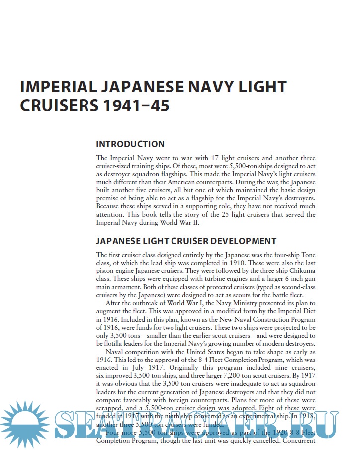 Year: 2012 Language: English Author: Mark Stille Genre: Historical Publisher: Osprey Publishing Edition: New Vanguard 187 Format: PDF Quality: eBook Pages count: 50 Description: Like their heavy cruiser brethren, the light cruisers built by the Imperial Japanese Navy in the build-up to WWII paid little more than lip service to the international naval treaties that were intended to keep the naval powers on a level playing field. The eight classes of light cruiser developed by the IJN were fast, well-armed, and technologically superior to the fleets the Allied powers could bring to bear. Serving with distinction across the Pacific Theatre, the IJN's light cruisers were committed to such actions as Midway and Leyte Gulf. Mark Stille continues Osprey's coverage of the IJN of WWII, with this concise and complete study of all 25 ships of the 8 light cruisers classes, from their design and development through to their ultimate fates. Detailed Osprey artwork and rare period photographs from the Fukui collection held in Kure, Japan, illustrate this discussion and provide great visual references for some of the most advanced naval vessels of WWII.