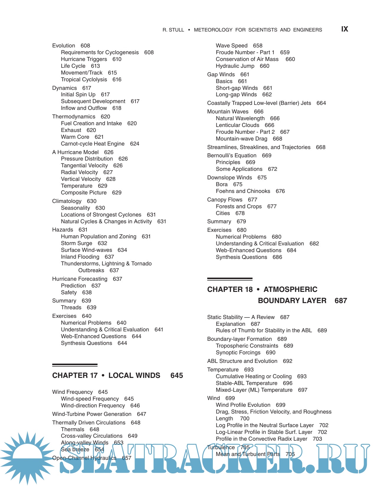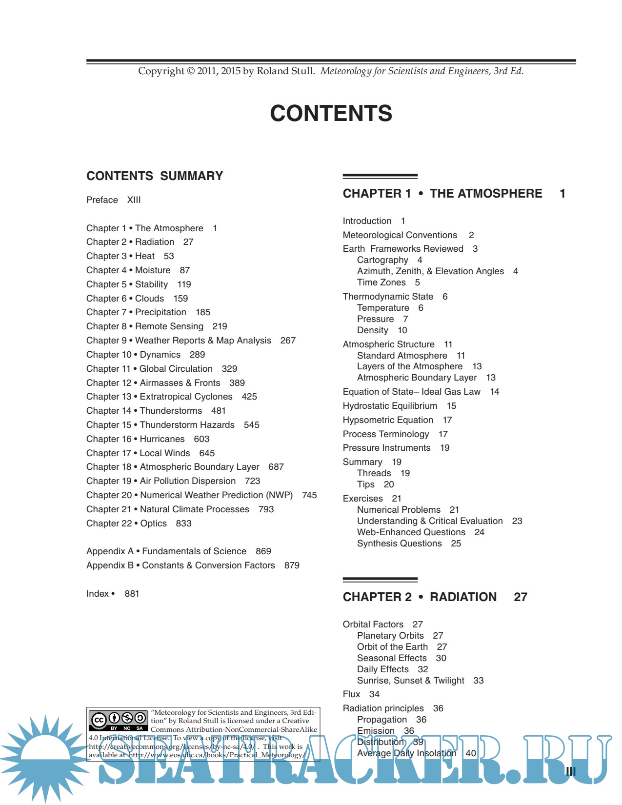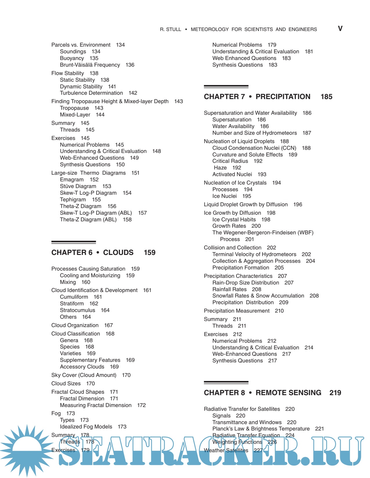 Year: 2015 Language: english Author: Stull R. Genre: Handbook Publisher: Sundog Publishing Edition: 3rd ISBN: 0888651767 Format: PDF Quality: Scanned pages Pages count: 940 Description: This book is designed for students and professionals who want to understand and apply basic meteorological concepts, but who don’t need to derive equations. To make this book accessible to more people, equations have been converted into algebra. With algebraic approximations to the atmosphere, you can see the physical meaning of each term and you can plug in numbers to get usable answers. No previous knowledge of meteorology is needed — the author starts from the basics. Your background should include algebra, trig, and classical physics. This book could serve the fields of Atmospheric Science, Meteorology, Environmental Science, Engineering, Air Quality, Climatology, and Geography. This book is designed to be both a textbook and a reference. As a textbook, the end of each chapter includes extensive homework exercises in categories inspired by Bloom’s taxonomy of learning actions: “Broaden Knowledge & Comprehension”; “Apply”; “Evaluate & Analyze”; and “Synthesize”. Although a hand calculator can be used for some of the homework exercises, other exercises are best solved on a computer spreadsheet such as Excel or using a mathematical program such as MATLAB, R, Mathematica, or Maple. I used Excel for my Sample Applications and most of my graphs.