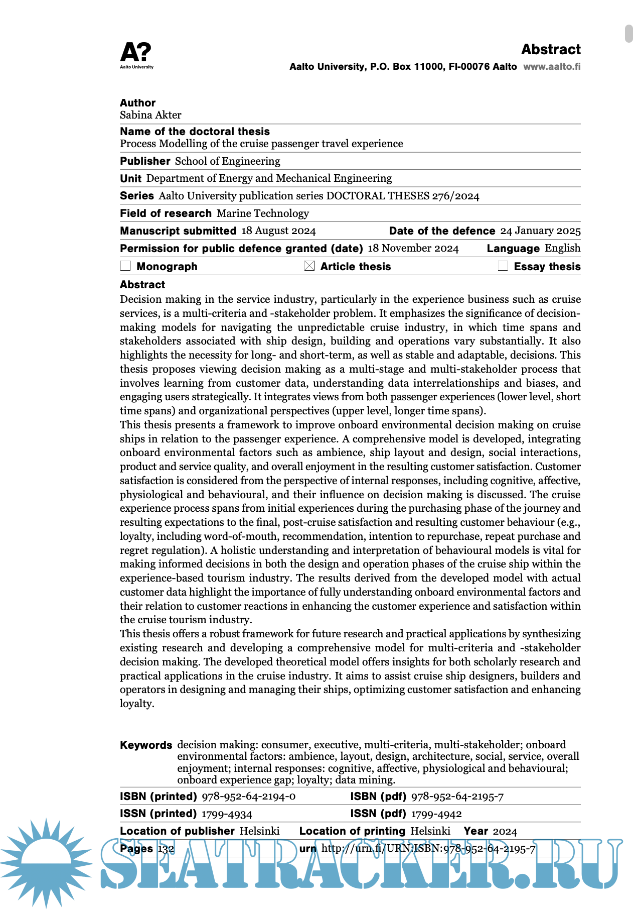 decision making: consumer, executive, multi-criteria, multi-stakeholder; onboard environmental factors: ambience, layout, design, architecture, social, service, overall enjoyment; internal responses: cognitive, affective, physiological and behavioural; onboard experience gap; loyalty; data mining.
