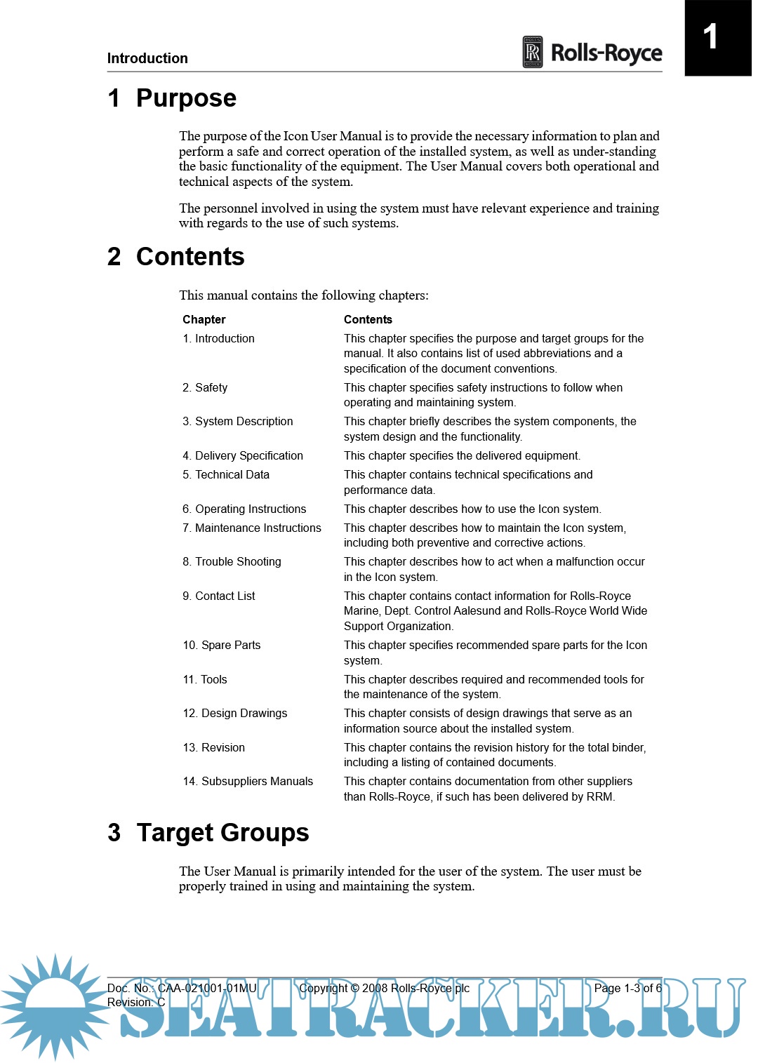 Year: 2013 Language: English Author: Rolls-Royce Genre: Operating Manual, User manual Publisher: Rolls-Royce Format: PDF Quality: eBook Pages count: 539 Description: The purpose of the Icon User Manual is to provide the necessary information to plan and perform a safe and correct operation of the installed system, as well as understanding the basic functionality of the equipment. The User Manual covers both operational and technical aspects of the system. The personnel involved in using the system must have relevant experience and training with regards to the use of such systems. The redundant Icon DP 2 system is based on a triple controller solution with a redundant fibre-optic network. Interface to sensors and position reference systems, power system and thruster system are split into logical groups, based on class requirements and system segregation. Additional info: The two versions of the user manual include different design drawings for different installations of the Icon DP2 system.