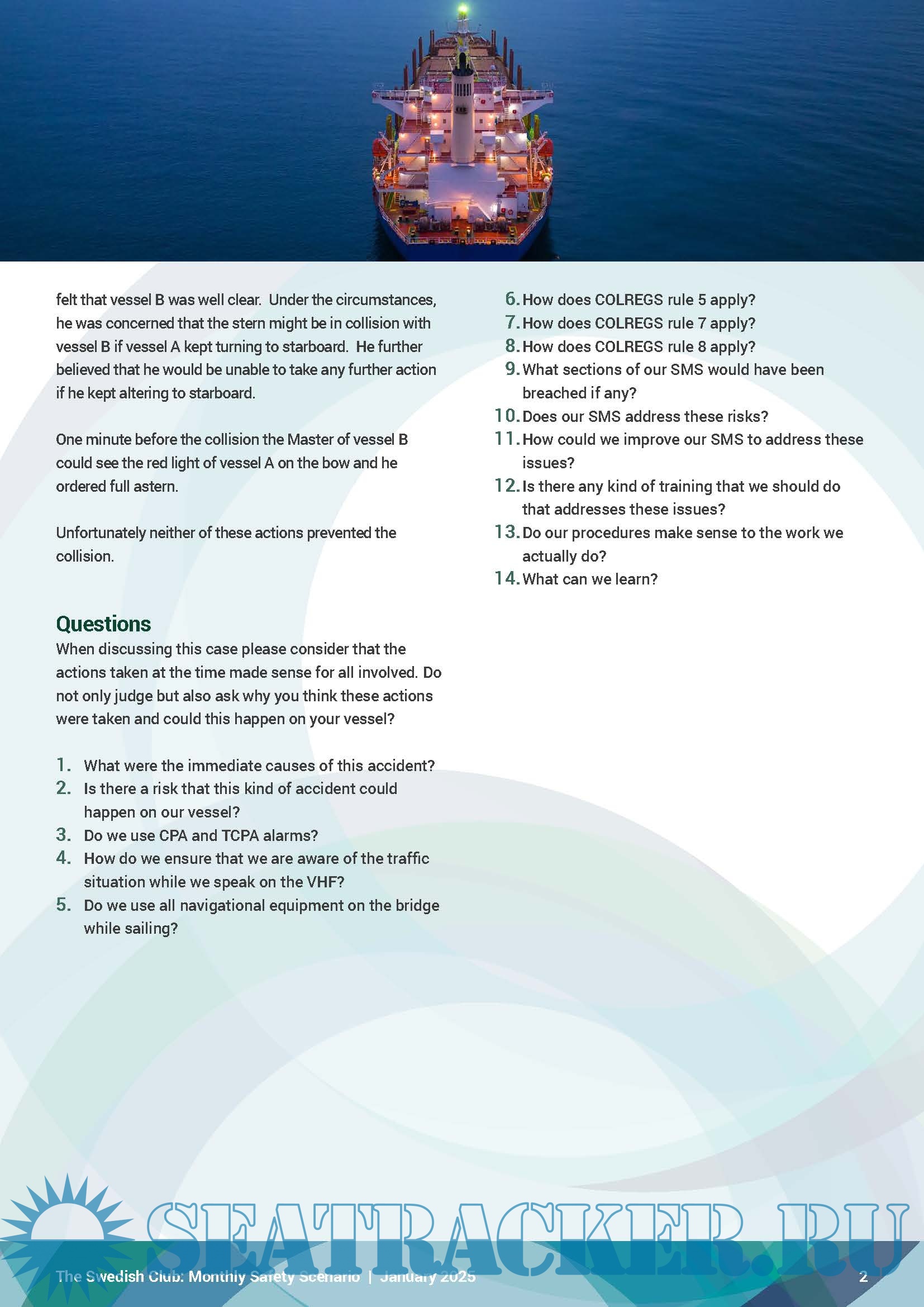 Year: 2025 Language: English Author: the Swedish Club Genre: Other, Periodical publication Edition: January 2025 Format: PDF Quality: eBook Pages count: 3 Description: The Club is publishing, on a monthly basis, a new Monthly Safety Scenario (MSS) to assist owners in their efforts of complying with the above regulations. Alternative scenarios will be uploaded in SCOL. It is easy to download the MSS and enter the written conclusions from the meeting and send feedback to the shore-based organisation. Issue January, 2025 | Collision at night Under the ISM requirement, owners are obliged to carry out monthly safety meetings or safety committee meetings onboard their vessels. This obligation stems from Chapter 5 of the ISM Code: “Master’s responsibility and authority” and furthermore from “5.1.2, motivating the crew in the observation of that policy.
