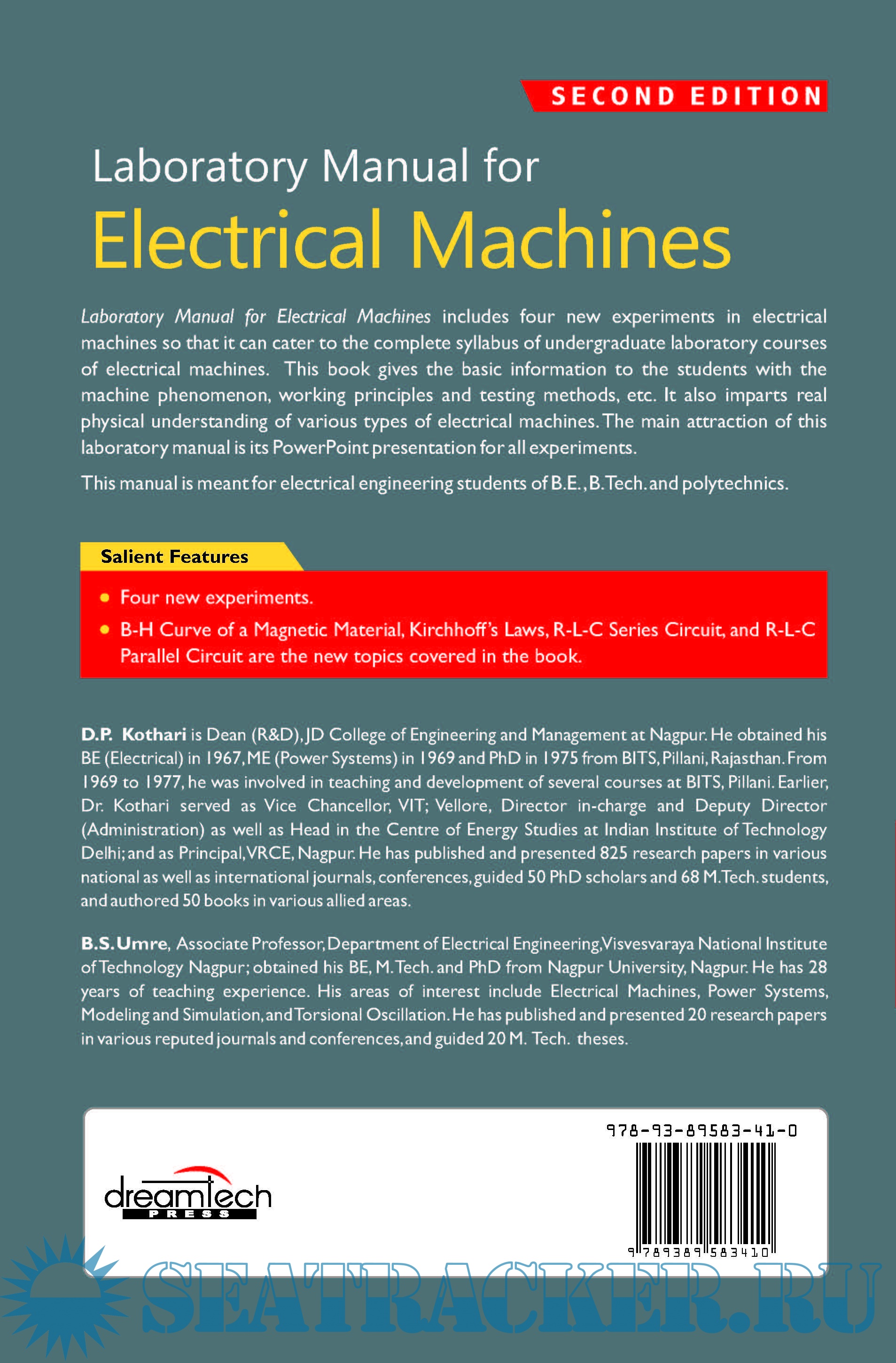 Description: Laboratory Manual for Electrical Machines (2nd) edition includes four new experiments in electrical machines so that it can cater to the complete syllabus of undergraduate laboratory courses of electrical machines. This book gives the basic information to the students with the machine phenomenon, working principles and testing methods, etc. It also imparts real physical understanding of various types of electrical machines.