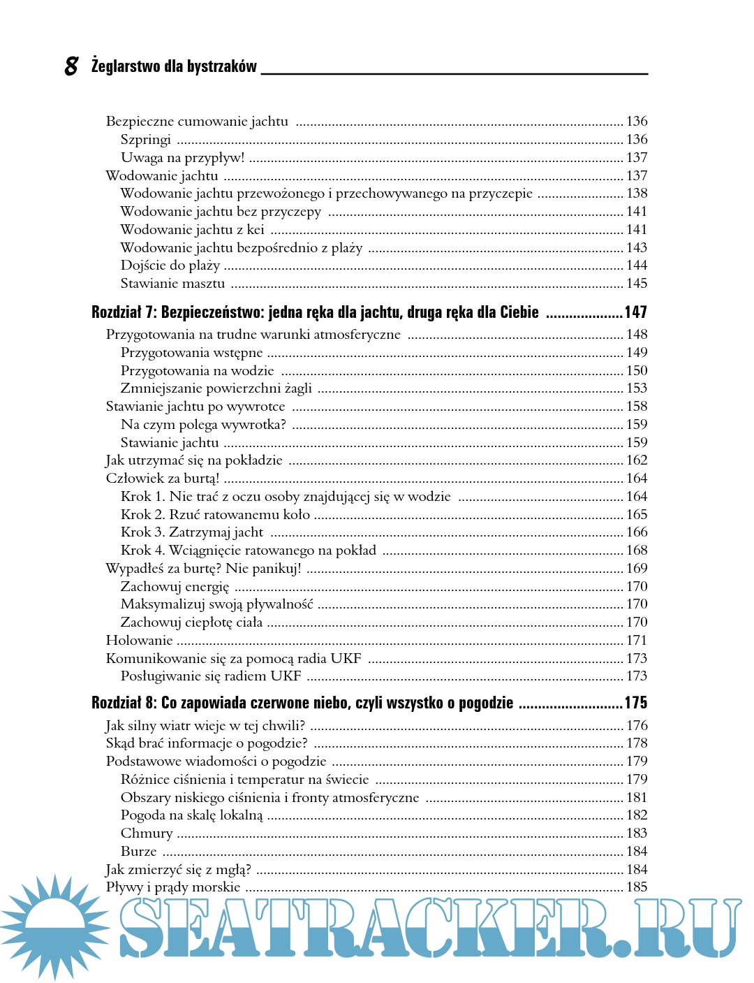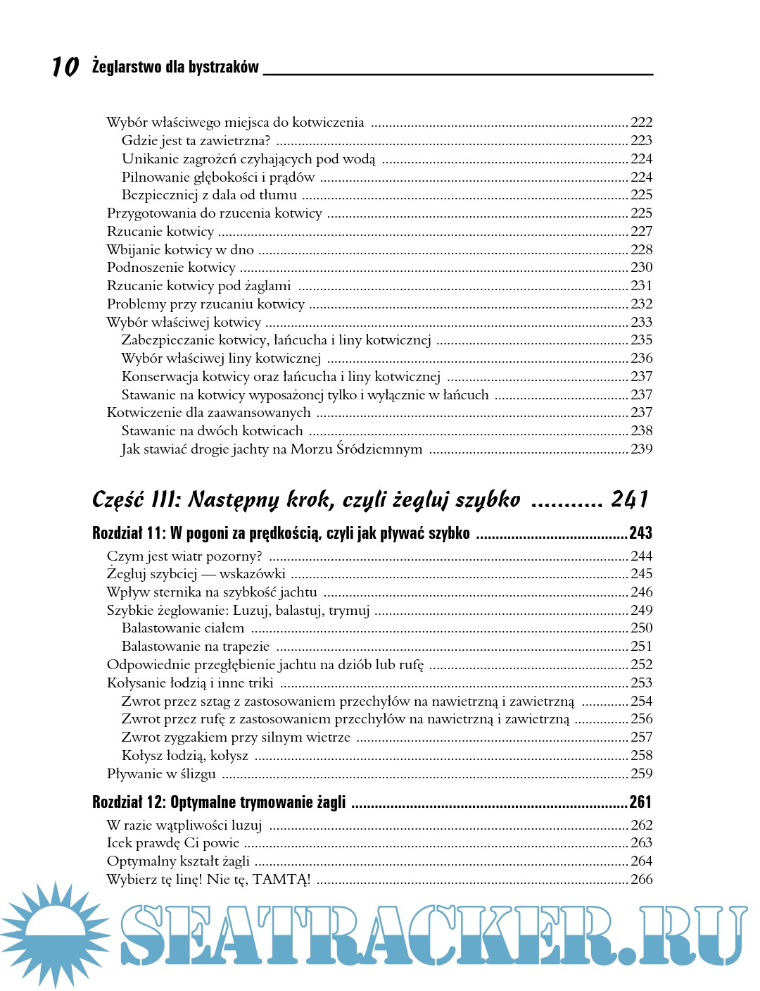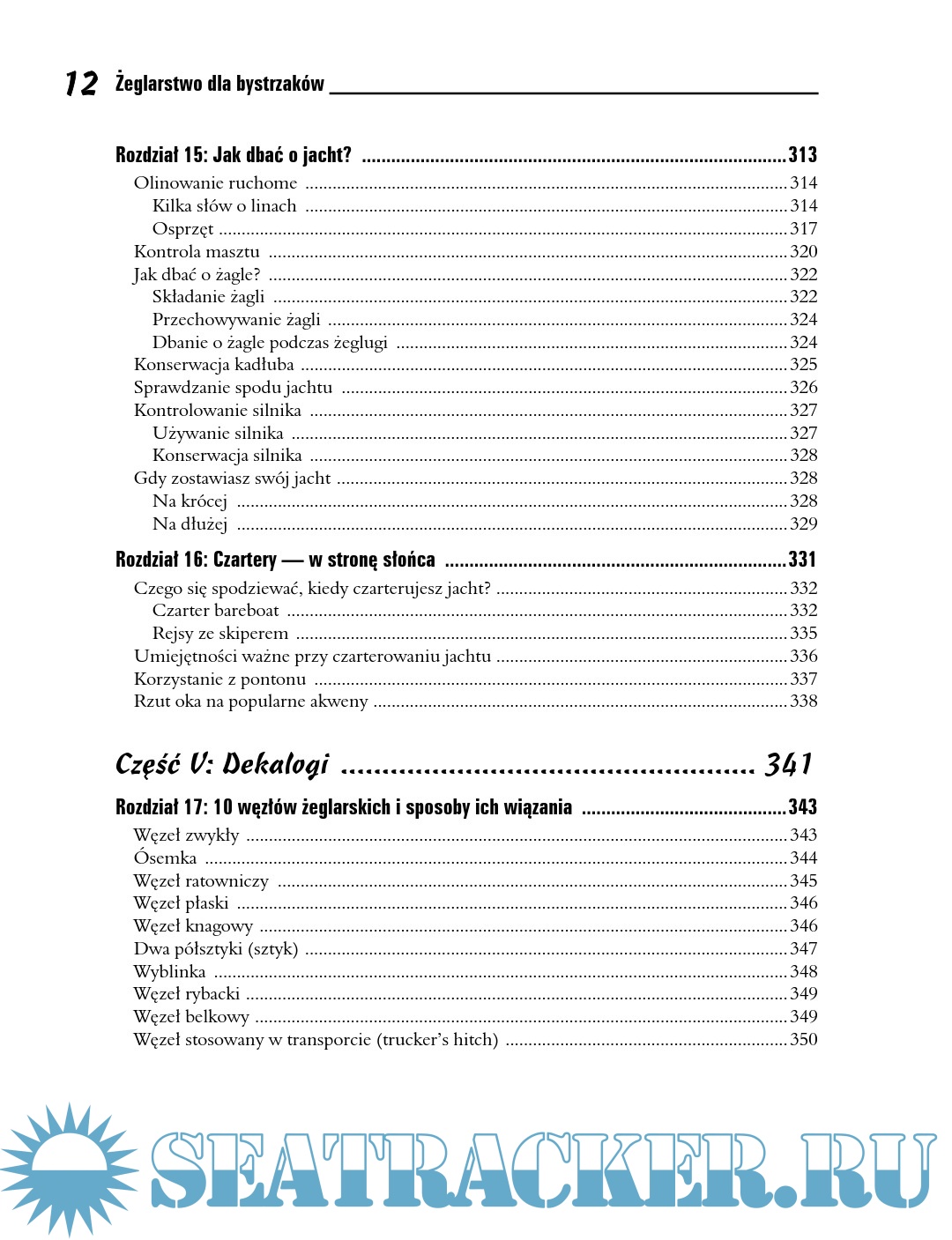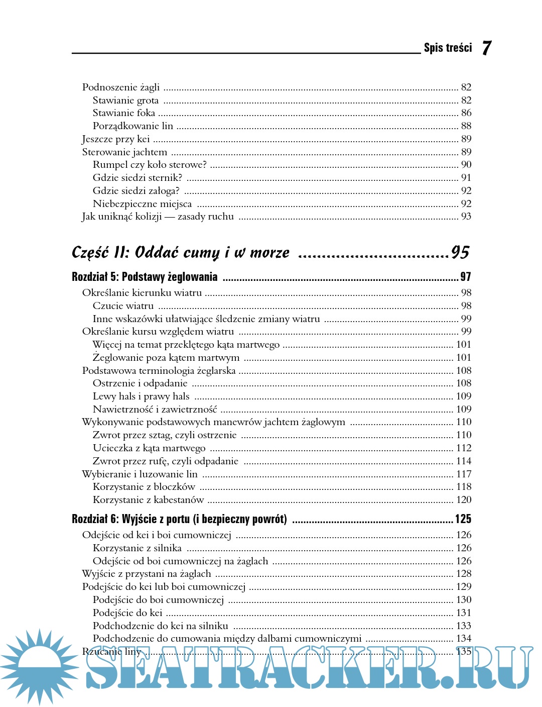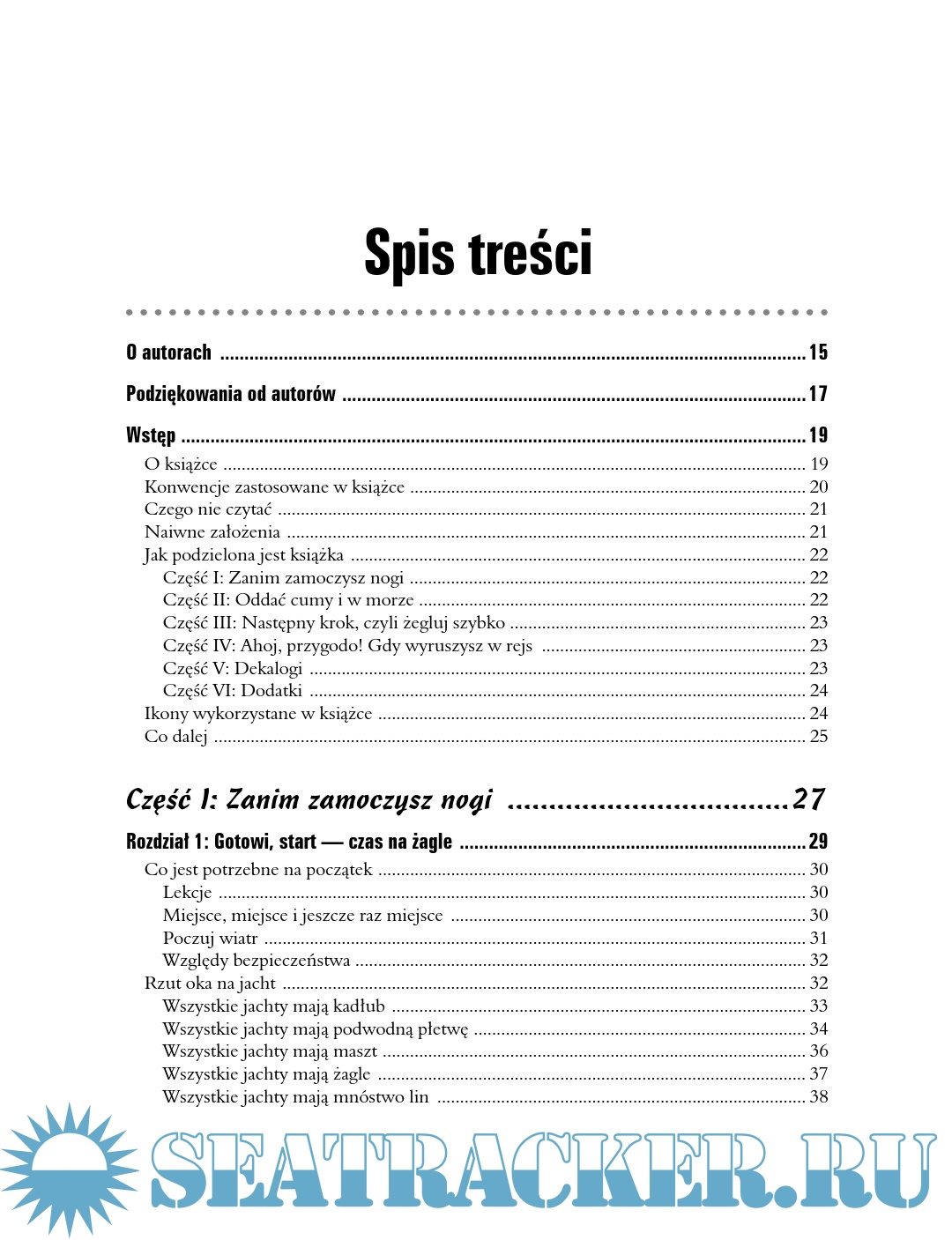 Year: 2008 Language: Polish Author: Isler J.J., Isler P. Genre: Manual Publisher: Dla bystrzaków ISBN: 978-83-246-7596-8 Format: PDF Quality: eBook Pages count: 396 Description: Marzy Ci się żeglowanie ku linii horyzontu? Delikatna bryza, prażące słońce, silne prądy i lazurowa toń wokół? Niestety, nie wiesz nawet, która burta jest prawa, która lewa, a przy okrzyku: "Uwaga na bom!" tracisz głowę dosłownie i w przenośni? Nic się nie martw! Po lekturze Żeglarstwa dla bystrzaków Twoim jedynym problemem na łódce będzie ewentualna choroba morska. Z tym praktycznym przewodnikiem, napisanym przez doświadczonych żeglarzy, zaczniesz wprawnie stawiać żagle, nawigować, kotwiczyć i cumować. Zdobędziesz najnowsze informacje o jachtach, przydatnym sprzęcie i zawodach regatowych. Nauczysz się fachowego słownictwa, niezbędnego na łódce, oraz podstaw dobrej praktyki żeglarskiej. Dowiesz się nawet, jak przetrwać sztorm i nie zanudzić się podczas flauty. Pierwsze kroki w szkole żeglarskiej. Odbijanie od kei i manewrowanie na żaglach. Nawigowanie, kotwiczenie i cumowanie. Najnowsza technologia nawigacji elektronicznej. Trudne sytuacje i nagłe niebezpieczeństwa. Czarter jachtu, udział w regatach. Zakup i troska o własną łódź.
