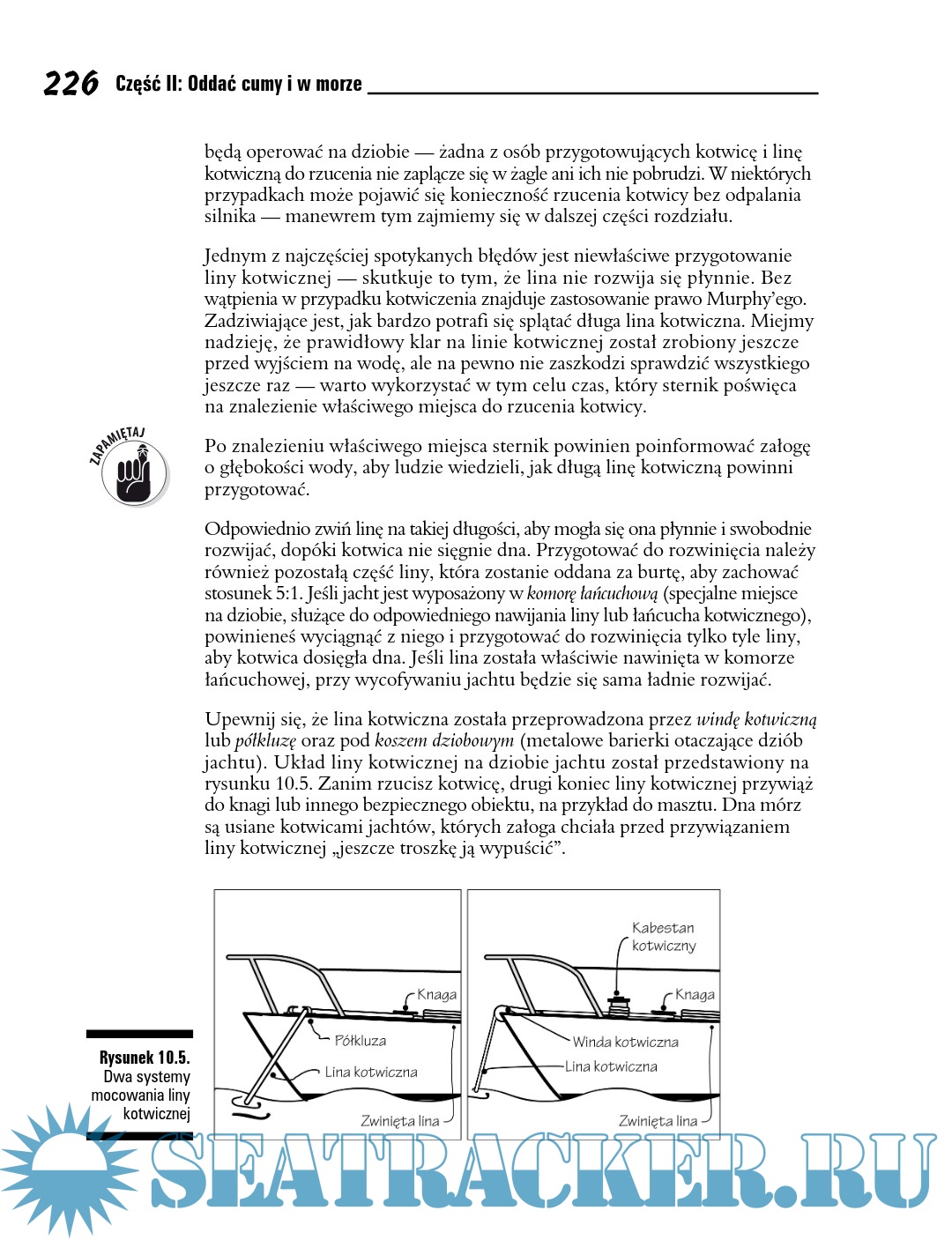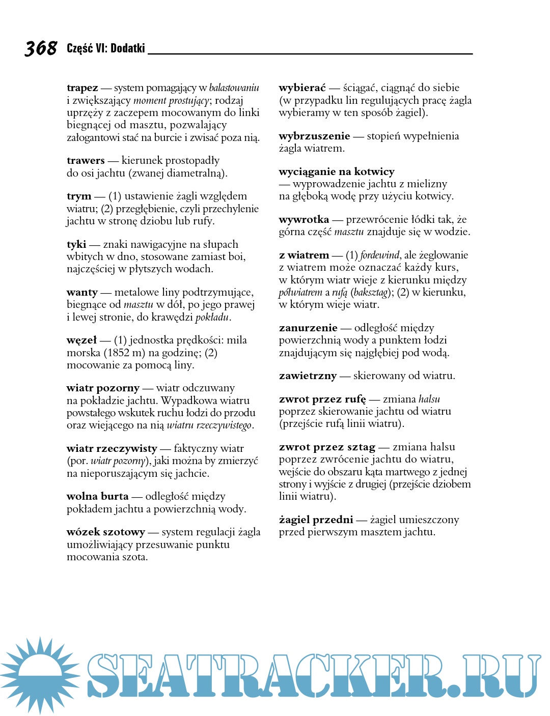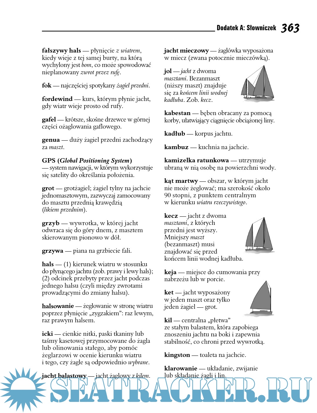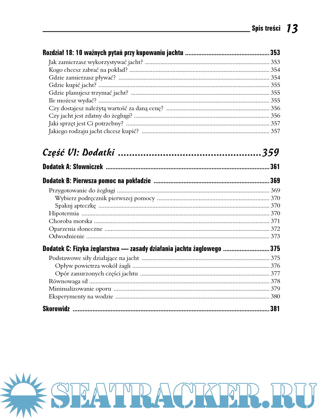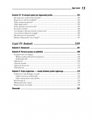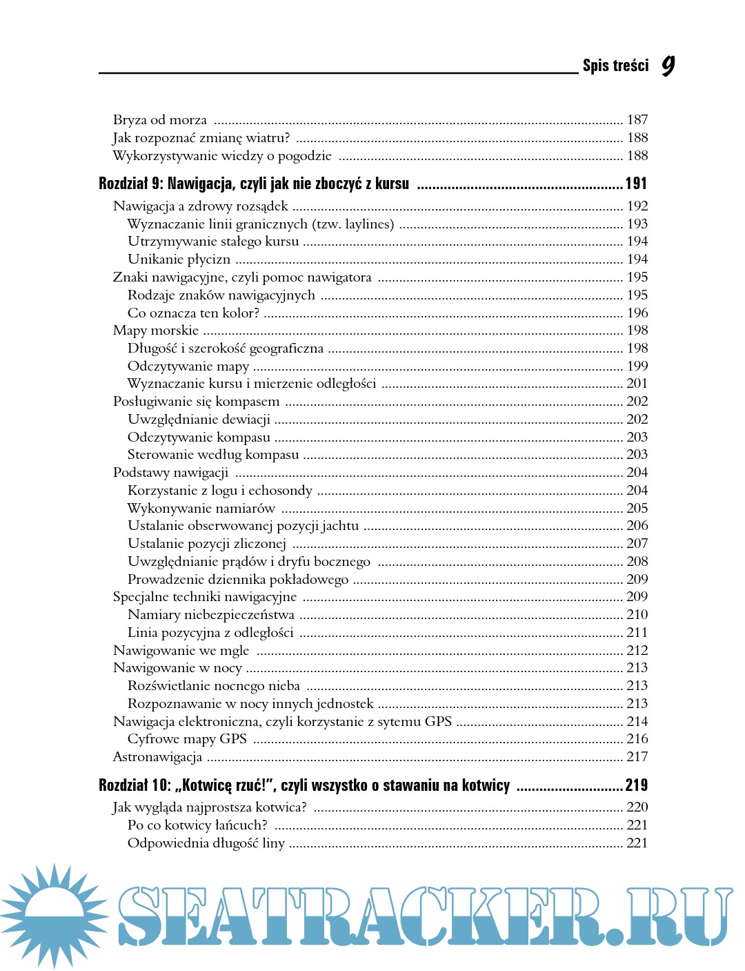 Year: 2008 Language: Polish Author: Isler J.J., Isler P. Genre: Manual Publisher: Dla bystrzaków ISBN: 978-83-246-7596-8 Format: PDF Quality: eBook Pages count: 396 Description: Marzy Ci się żeglowanie ku linii horyzontu? Delikatna bryza, prażące słońce, silne prądy i lazurowa toń wokół? Niestety, nie wiesz nawet, która burta jest prawa, która lewa, a przy okrzyku: "Uwaga na bom!" tracisz głowę dosłownie i w przenośni? Nic się nie martw! Po lekturze Żeglarstwa dla bystrzaków Twoim jedynym problemem na łódce będzie ewentualna choroba morska. Z tym praktycznym przewodnikiem, napisanym przez doświadczonych żeglarzy, zaczniesz wprawnie stawiać żagle, nawigować, kotwiczyć i cumować. Zdobędziesz najnowsze informacje o jachtach, przydatnym sprzęcie i zawodach regatowych. Nauczysz się fachowego słownictwa, niezbędnego na łódce, oraz podstaw dobrej praktyki żeglarskiej. Dowiesz się nawet, jak przetrwać sztorm i nie zanudzić się podczas flauty. Pierwsze kroki w szkole żeglarskiej. Odbijanie od kei i manewrowanie na żaglach. Nawigowanie, kotwiczenie i cumowanie. Najnowsza technologia nawigacji elektronicznej. Trudne sytuacje i nagłe niebezpieczeństwa. Czarter jachtu, udział w regatach. Zakup i troska o własną łódź.