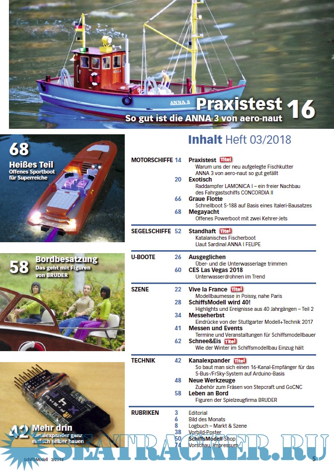 Year: 2018 Language: German Author: Mario Bicher (Redaktor) Genre: Periodical publication Edition: 2018-03 Format: PDF Quality: eBook Pages count: 76 Description: SchiffsModell is the magazine for those who enjoy radio controlled and fully functional Modellnachbauten of ships of all kinds.
