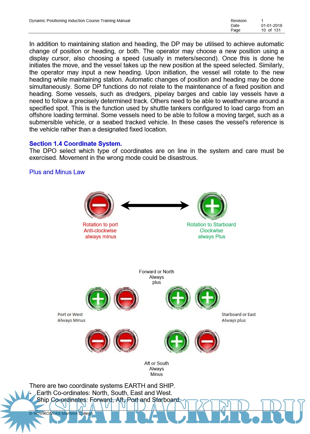 Year: 2018 Language: English Author: Novikontas Maritime College Genre: Training Course, Training manual Format: PDF Quality: eBook Pages count: 132 Description: The Dynamic Positioning (DP) Induction Course will provide an in-depth understanding of the positioning system as it is used to compensate for vessel movement. It will cover vessels’ DP referencing systems, sensors, power plants, thrusters and feedback systems. Those who successfully complete this course should have acquired a knowledge of the principles of Dynamic Positioning, be able to set up a Dynamic Positioning system and have an understanding of the practical operation of associated equipment, including position reference systems. Trainees should be able to recognize and respond to the various alarms, warning and information messages. Trainees should also be able to relate the DP installation to the ship system, e.g. power supply, maneuvering facility, available position reference systems and nature of work. Trainees should also be able to relate DP operations to the existing environmental conditions of wind, sea state, current and vessel movement.