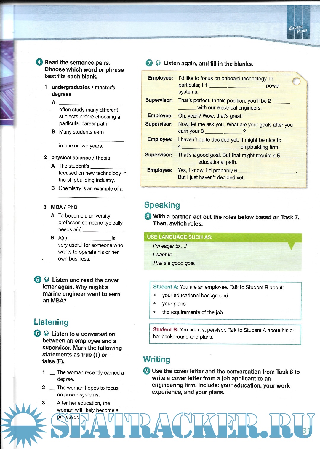 Career Paths: Marine Engineering - это новый образовательный ресурс для профессионалов морской индустрии, которые хотят улучшить свои навыки общения на английском языке в рабочей среде. Включая специфический для карьеры словарь и контексты, каждый блок предлагает пошаговые инструкции, которые погружают студентов в четыре ключевых языковых компонента: чтение, аудирование, говорение и письмо.