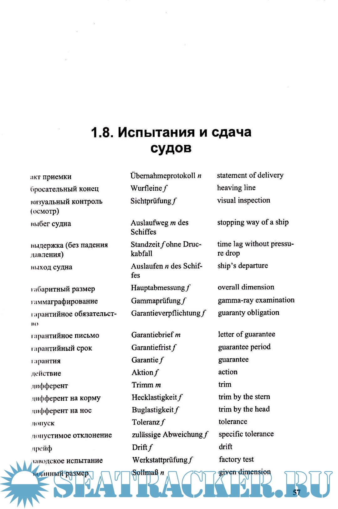 Year: 2003 Language: English, Russian, German Author: Вибек Е. Genre: Dictionary Publisher: СПб.: Элмор Format: PDF, DjVu Quality: eBook Pages count: 175 Description: The dictionary, which unites about 1600 terms used in shipyard practice, includes two main sections. The first of them is built according to the "Russian-English-German" placement scheme. Within it, the presented terms are grouped into nine special topics. The second section contains three combined dictionary blocks, within which the same terms are built according to the schemes: Russian-English-German, English-German-Russian and German-Russian-English dictionaries. Das Wörterbuch, das rund 1600 Begriffe aus der Werftpraxis vereint, umfasst zwei Hauptteile. Der erste davon ist nach dem „Russisch-Englisch-Deutsch“-Prinzip aufgebaut. Darin sind die vorgestellten Begriffe in neun Spezialthemen gruppiert. Der zweite Abschnitt enthält drei kombinierte Wörterbuchblöcke, innerhalb derer dieselben Begriffe nach Schemata angeordnet sind: Russisch-Englisch-Deutsch-, Englisch-Deutsch-Russisch- und Deutsch-Russisch-Englisch-Wörterbücher. Словарь, объединяющий около 1600 терминов, используемых в практике работы судоверфей, включает в себя два основных раздела. Первый из них построен по 'русско-англо-немецкой' схеме размещения. В его пределах представляемые термины сгруппированы по девяти специальным темам. Второй раздел содержит три объединенных словарных блока, в пределах которых те же термины выстроены по схемам: русско-англо-немецкий, англо-немецко-русский и немецко-рксско-английский словари.