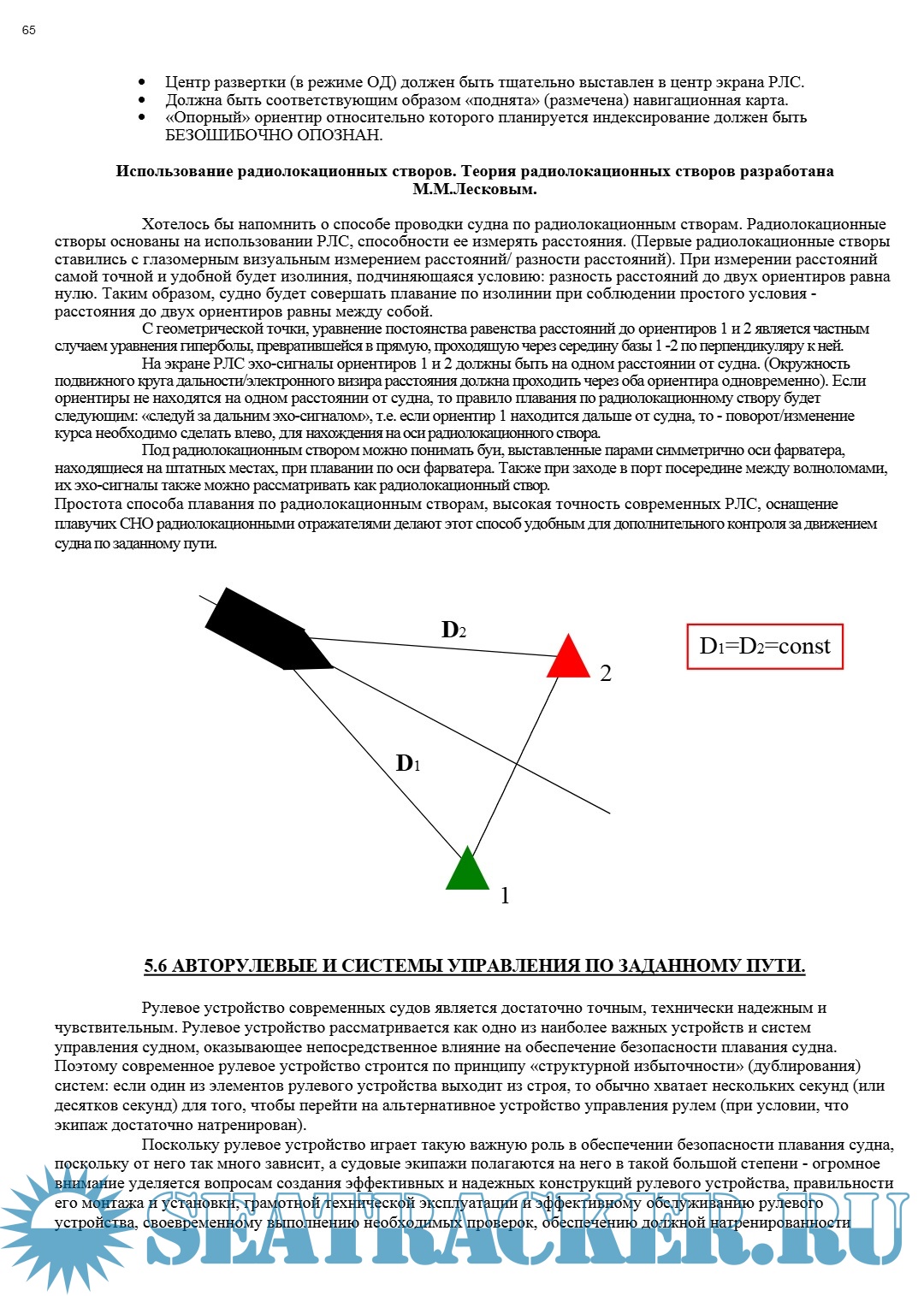 Год выпуска: 2007 Язык: Русский Автор: Бусленко Д.Н. Жанр: Учебное пособие Издательство: Морской колледж им. Г.Я. Седова Формат: PDF Качество: Изначально компьютерное (eBook) Количество страниц: 114 Описание: Этот документ содержит требование относительно управления командой мостика BRIDGE TEAM MANAGEMENT (Организация ходовой навигационной вахты), т.е. подготовки судна к плаванию в стесненных водах, входу и выходу из порта с заполнением “Pilot Card”, “Check List”, подготовки плана перехода судна с заполнением “Voyage Plan”, подготовки судна и экипажа к действиям в экстремальных условиях, с записями в судовом журнале и весь ряд требований, предъявляемых к судам и сертификации судоводителей согласно раздела A-II/2 Конвенции ПДМНВ-78/95. Программа курса «Организация ходовой навигационной вахты» предназначена для тренажерной подготовки судоводителей, направленной на отработку организации ходовой навигационной вахты на судах в различных условиях плавания. Целью настоящего курса является привитие и отработка навыков по управлению составом навигационной вахты и ресурсами мостика и судна, распределению обязанностей среди членов вахты с учетом индивидуальных особенностей, отработка динамических стереотипов действий вахтенного помощника капитана и капитанов в штатных и нестандартных (аварийных) ситуациях. Программа курса выполняется на полнофункциональном навигационном тренажере, воспроизводящем как все навигационные и метеорологические условия, так и особенности поведения судов. Наличие средств связи способствует привитию навыков по организации связи, особенно в аварийных ситуациях. Планированию перехода, контролю за нахождением судна на выбранном (проложенном) маршруте, использованию технических средств судовождения посвящены отдельные разделы программы. Программа курса составлена с учетом международных требований, изложенных в Кодексе к ПДНВ-78/95 с поправками по функции «Судовождение», а также с учетом опыта проведения тренажерной подготовки по курсу «Организация ходовой навигационной вахты» в Морском УТЦ Радиоэлектроники РМК им. Г.Я. Седова. Программа предусматривает лекционные, практические занятия, выполнение упражнений на полнофункциональном навигационном тренажере, самостоятельную работу слушателей по изучению и повторению нормативных документов по безопасности мореплавания, а также по планированию перехода с последующей проверкой инструктором. По итогам выполненных упражнений и итогового упражнения с лоцманом, инструктором принимается решение об успешности прохождения данного курса конкретным слушателем и возможности выдачи сертификата. В процессе выполнения упражнений во время тренажерной подготовки рекомендуется выполнять все действия как на реальном судне, только в этом случае результат и эффект от пройденного обучения будет максимальным и долгосрочным. Настоящее пособие является дополненным и исправленным с учетом замечаний, а также новых руководящих международных и национальных документов Российской Федерации пособием по Организации Ходовой навигационной вахты издания 2003 года.
